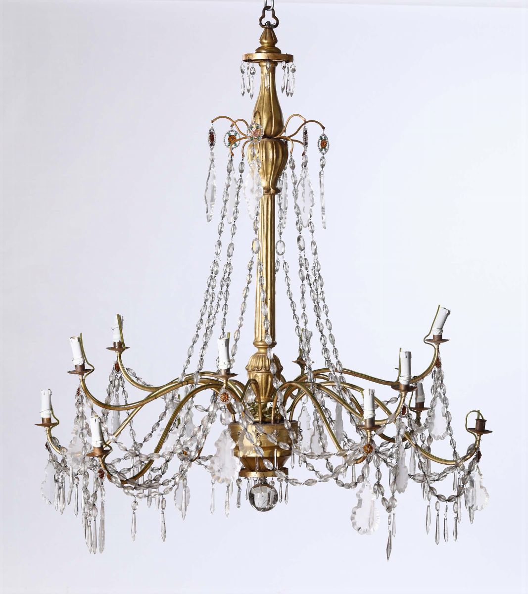 Coppia di lampadari a 12 luci in legno dorato e cristalli, fine XVIII secolo