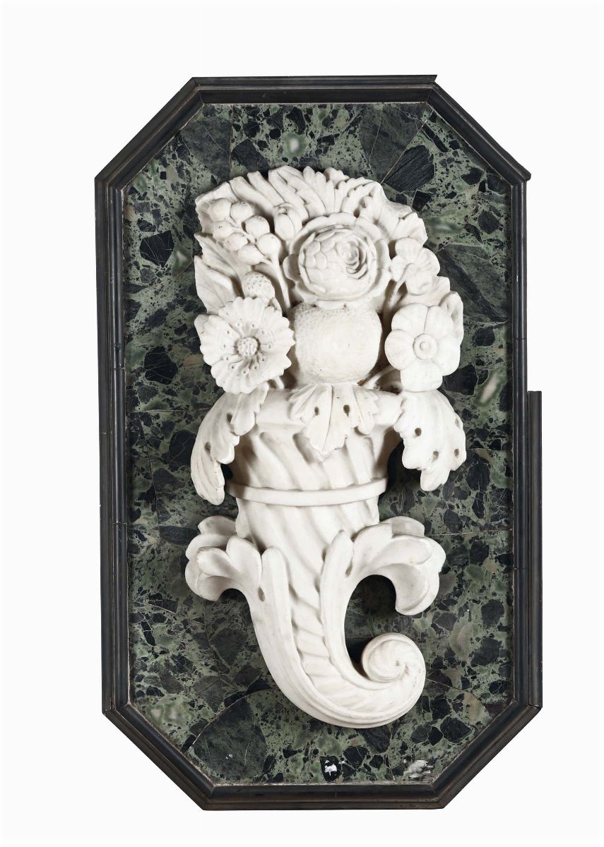 Coppia di placche con cornucopie fiorite in marmo bianco, XIX secolo