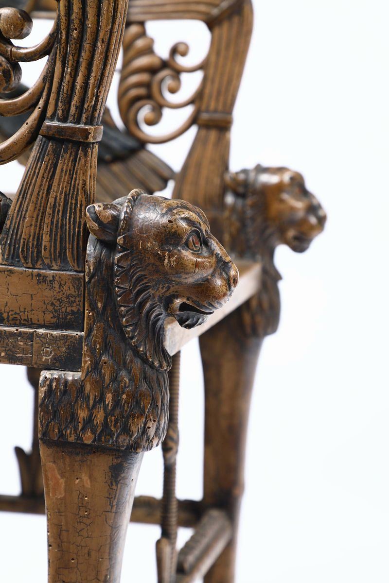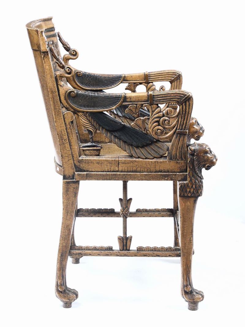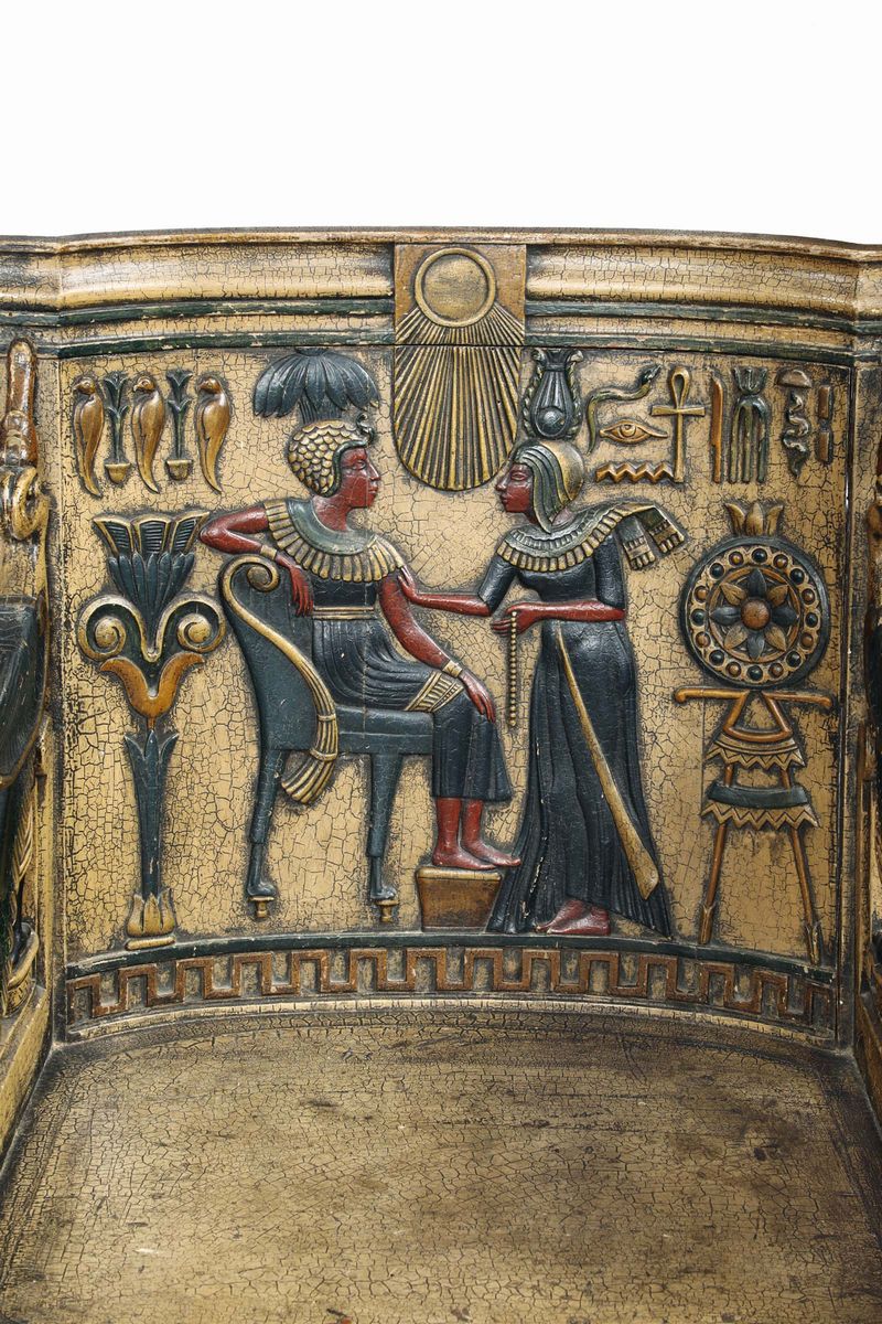 schienale decorato a motivi retour d'Egypte, teste ferine in rilievo, cm 65x70x102