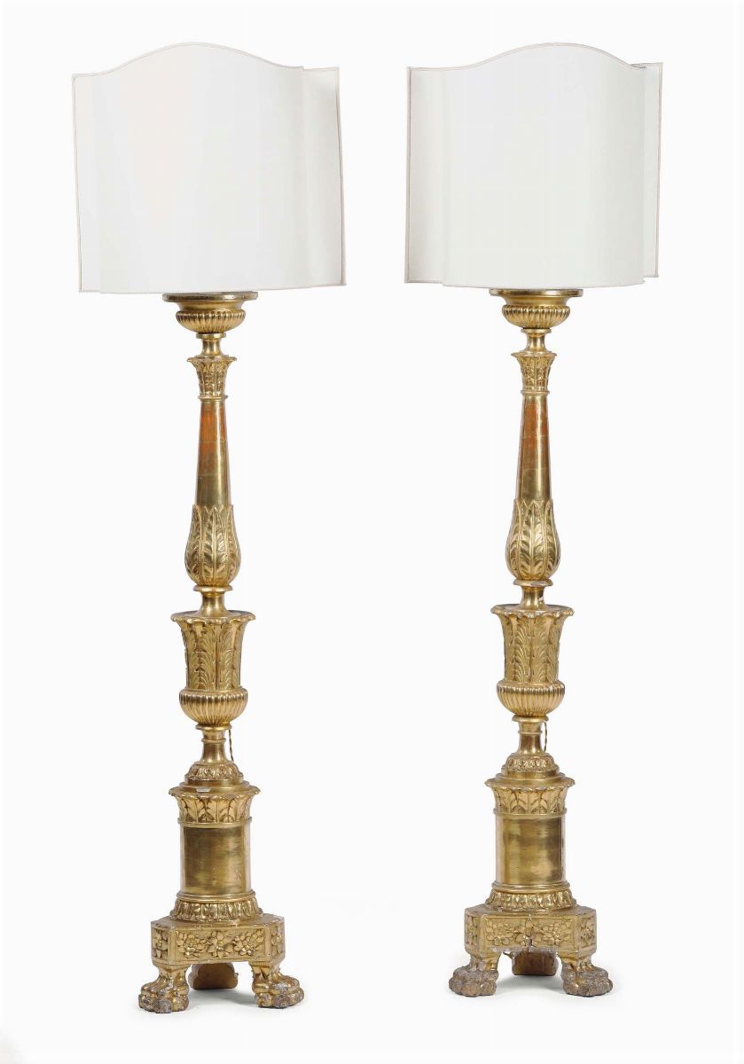 Coppia di portaceri in legno intagliato e dorato, XVIII secolo