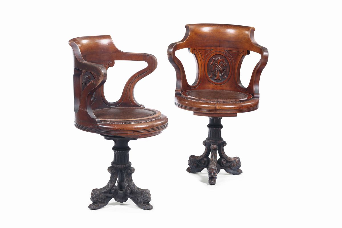 Coppia di sedie in legno intagliato e base in ghisa