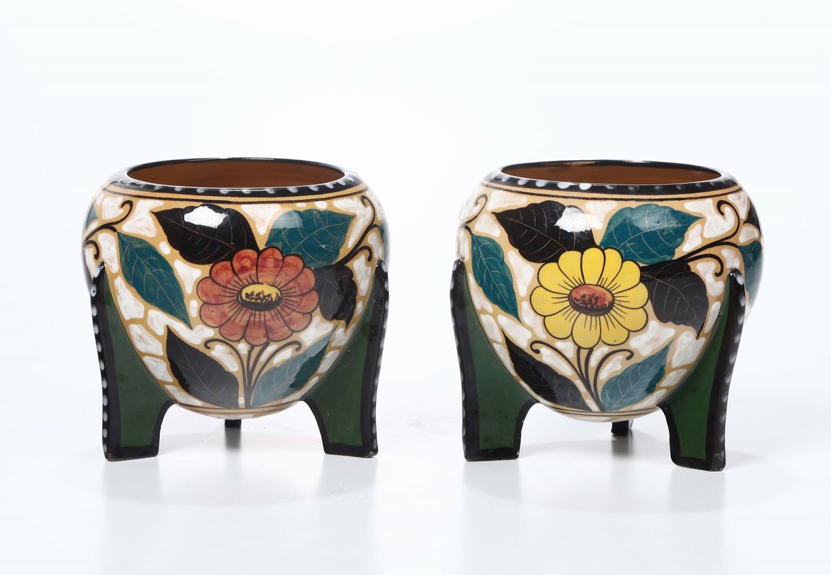 Coppia di vasi in ceramica di foggia globulare, base tripode decoro vegetale di fantasia, manifattura italiana, anni '30