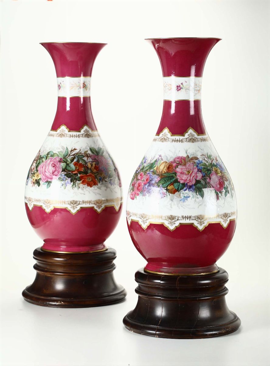Porcellana, basi in legno. Marca: assente. Altezza totale cm 85; altezza vasi cm 68,5. Ottimo stato di conservazione