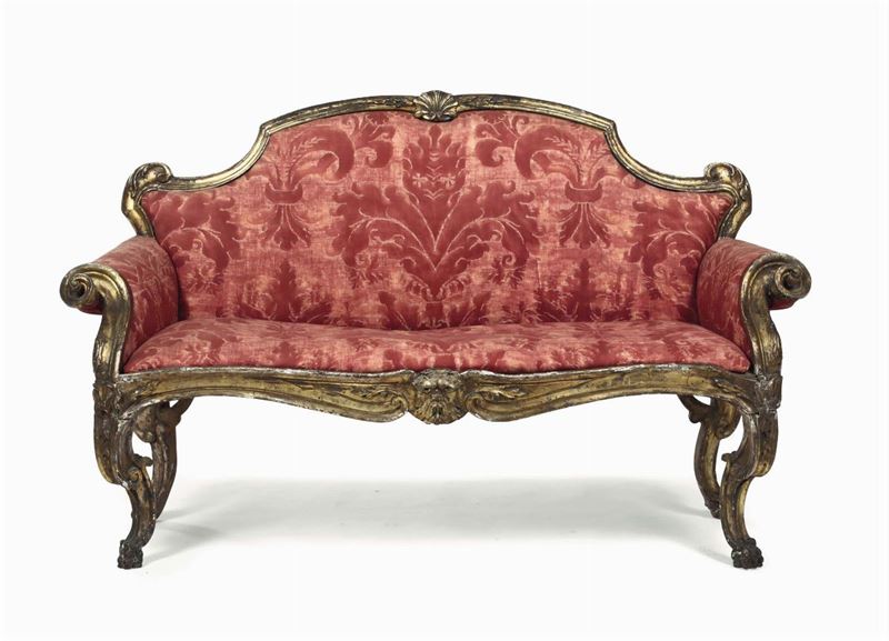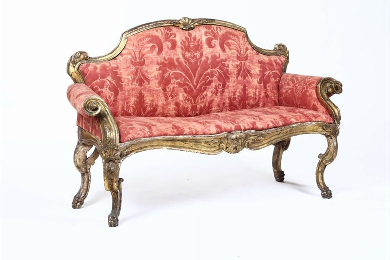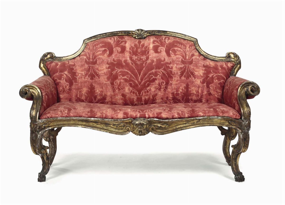 schienale sagomato, braccioli a ricciolo, gambe arcuate, seduta e schienale rivestiti in tessuto damascato rosso, cm 155x46x97