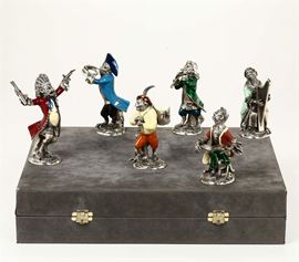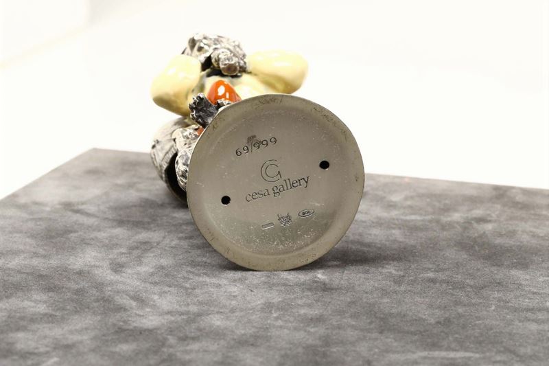 Gruppo di sei statuine della serie Monkeys orchestra in argento 800 e smalti colorati della ditta Cesa Gallery