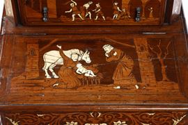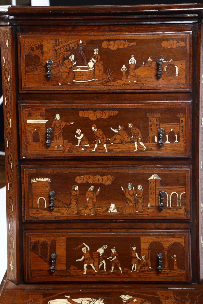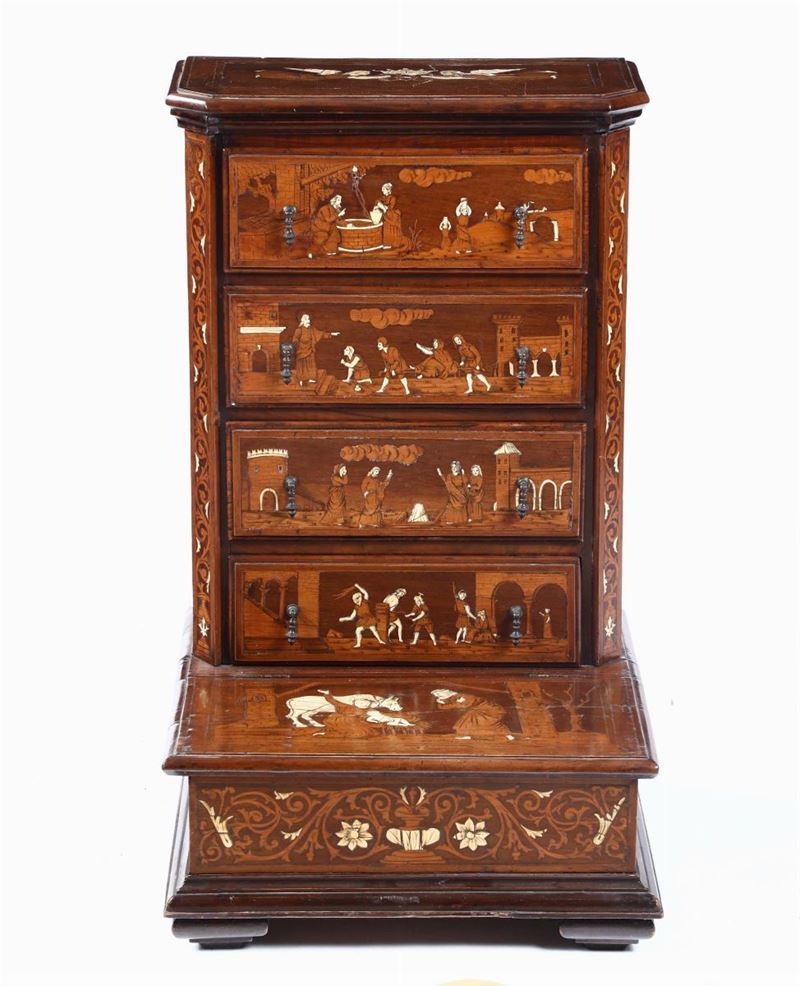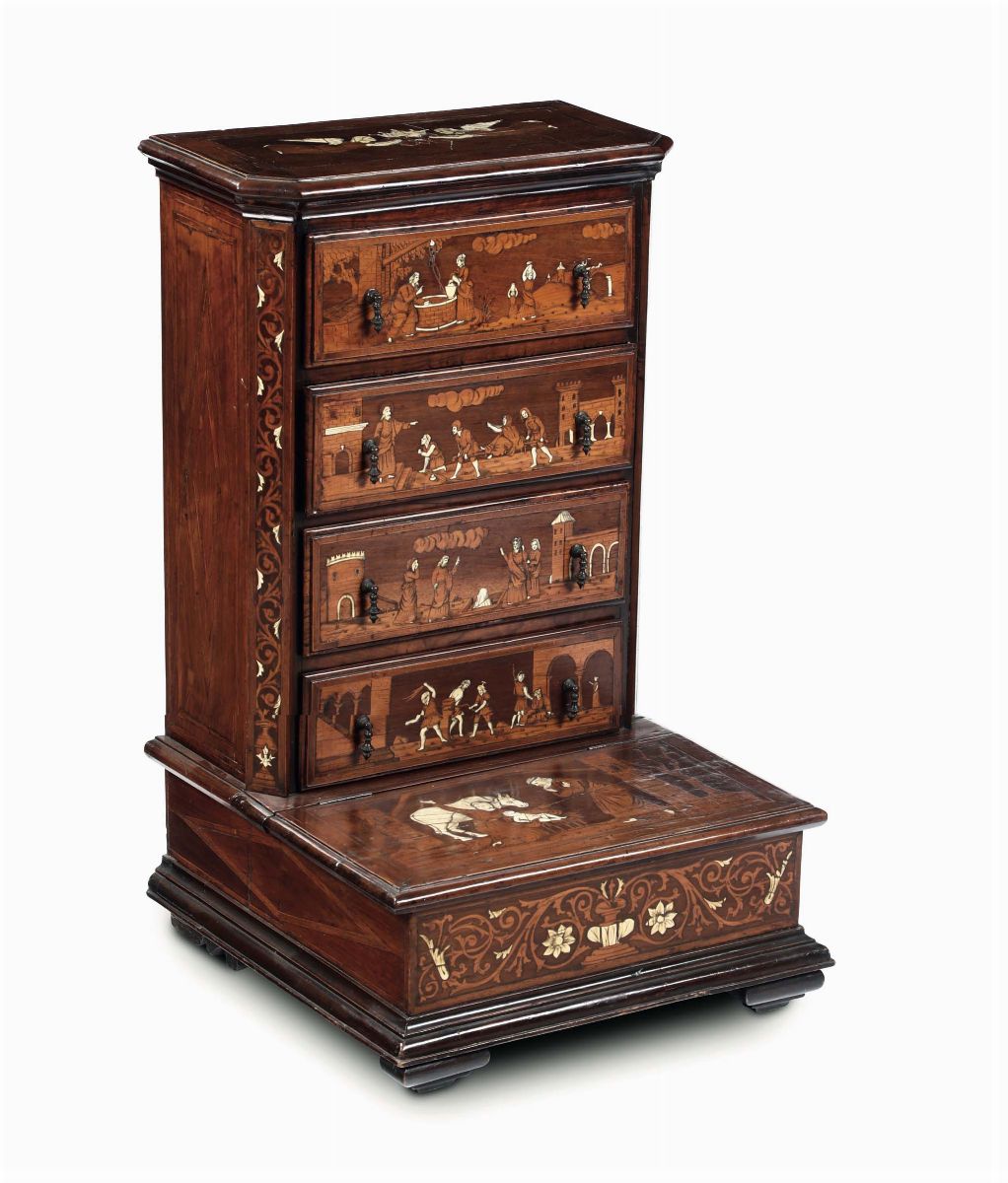 Inginocchiatoio a cassetti in noce intarsiato in avorio ed essenze pregiate. Italia XVIII secolo