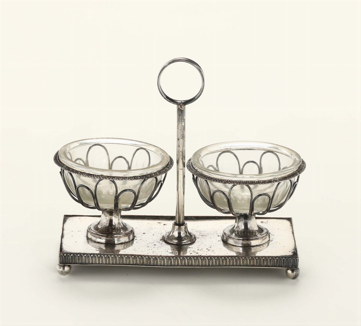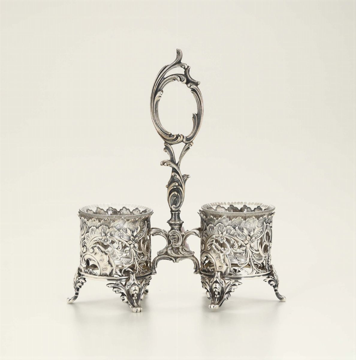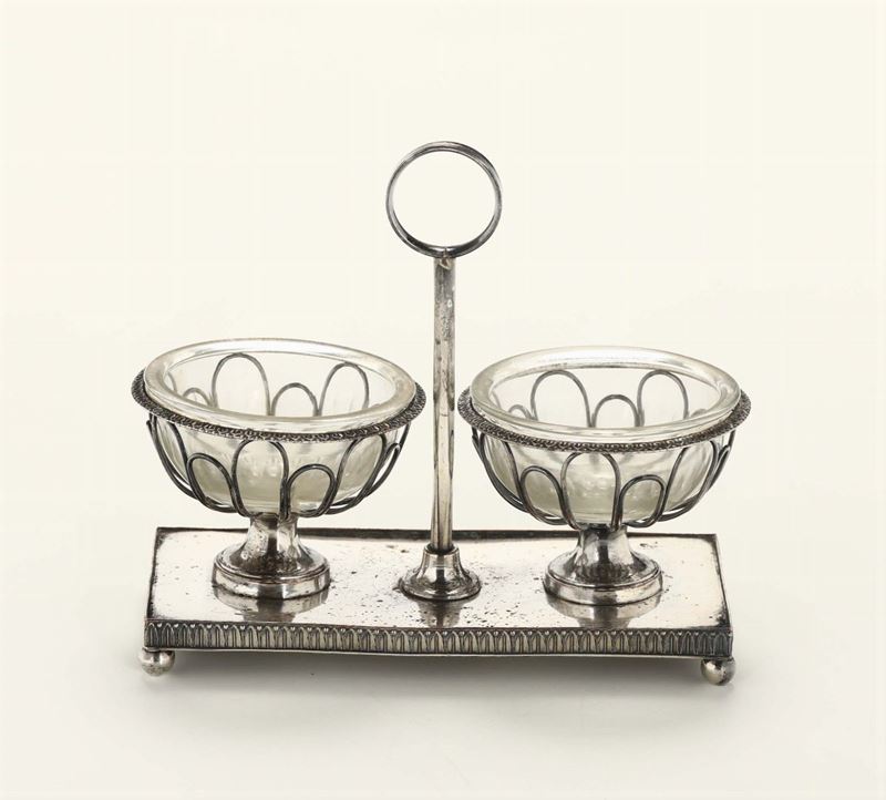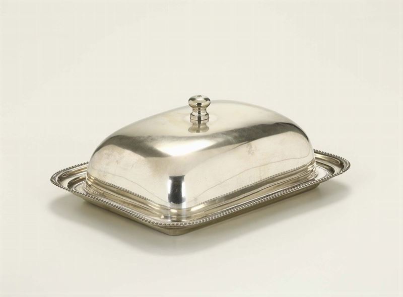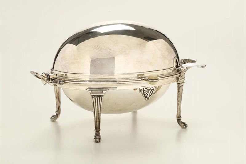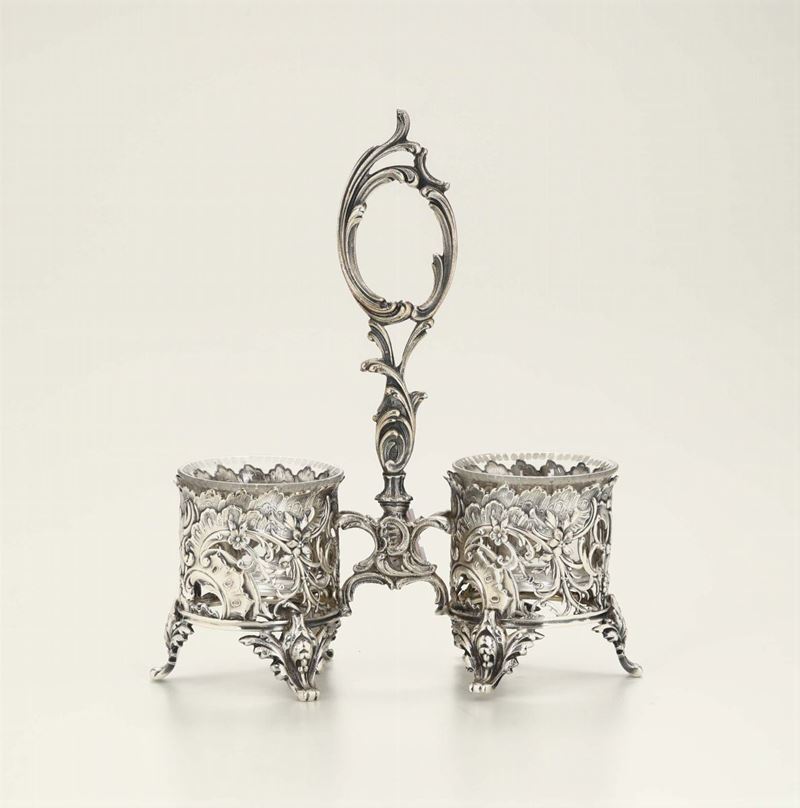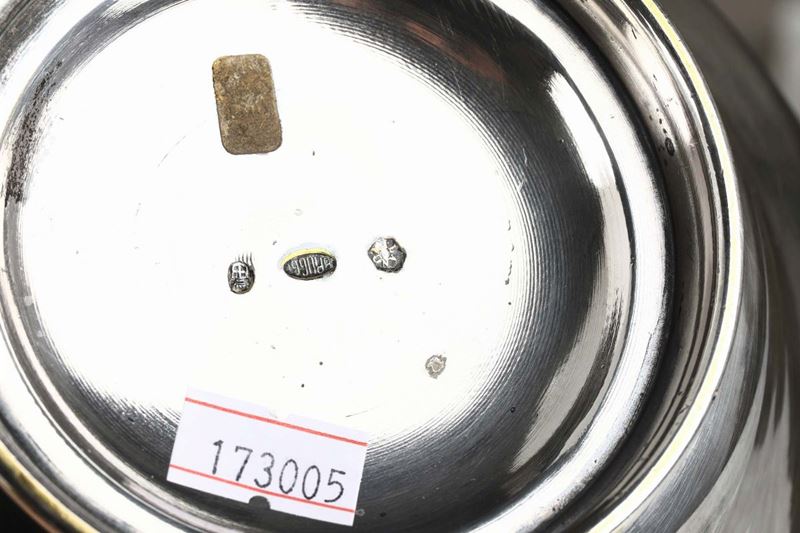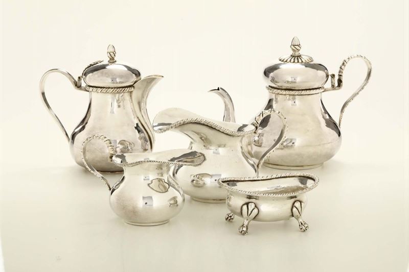 composto da samovar (altezza cm 30), scaldavivande (cm 30x20x19), coppia di candelieri (h cm 21), porta ampolle, saliera doppia (cm 14x6x16), burriera (cm 20x15) e servizio composto da caffettiera, lattiera, teiera, bricco e zuccheriera
