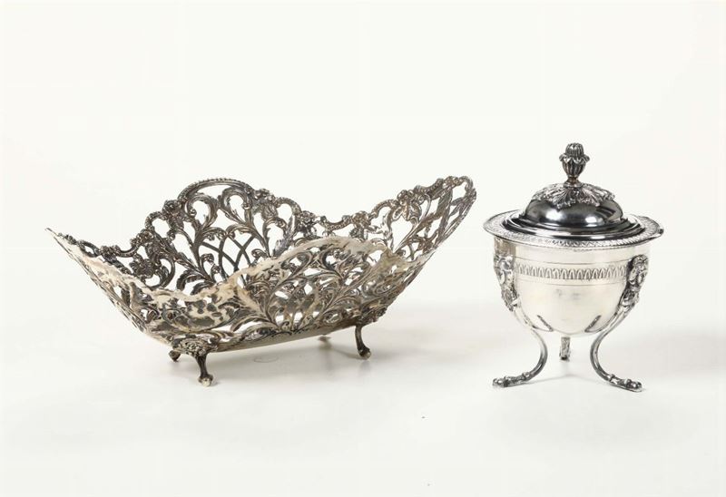Lotto composto da zuccheriera e cestino traforato in argento, XX secolo
