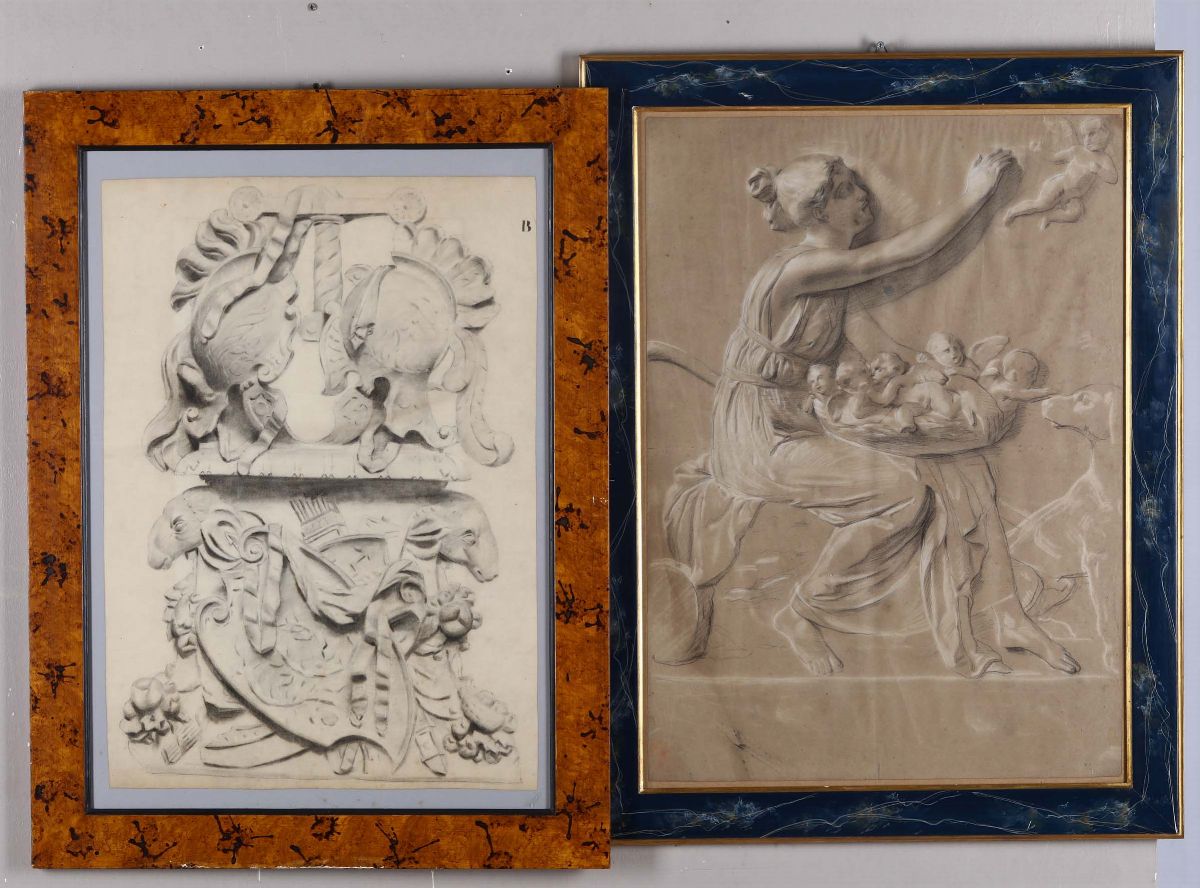 Divinità romana con erotini svolazzanti; Studio per una panoplia classicheggiante, grafite, carboncino e biacca su carta