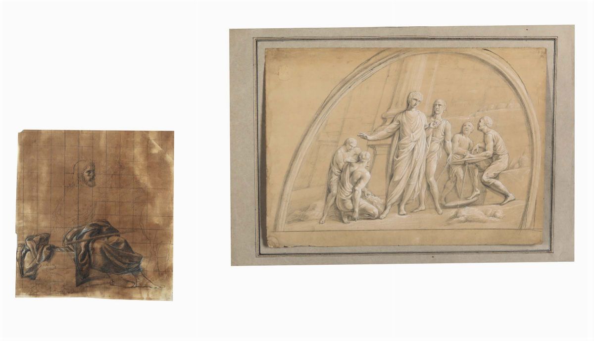 Scena tratta dall’Antichità Classica, probabile schizzo per una lunetta, grafite e carboncino lumeggiati a biacca su carta marroncina, mm 285x400 probabile scuola toscana, primo terzo del XIX secolo; Studio per un Cristo seduto, matita e carboncino con lumi a biacca delegante descrizione sul retro Banoferi Angelo, Setri ponente, 1744-1793 con discepolo di Mengs e Hamilton (Asta Christie’s Roma) mm 240x230