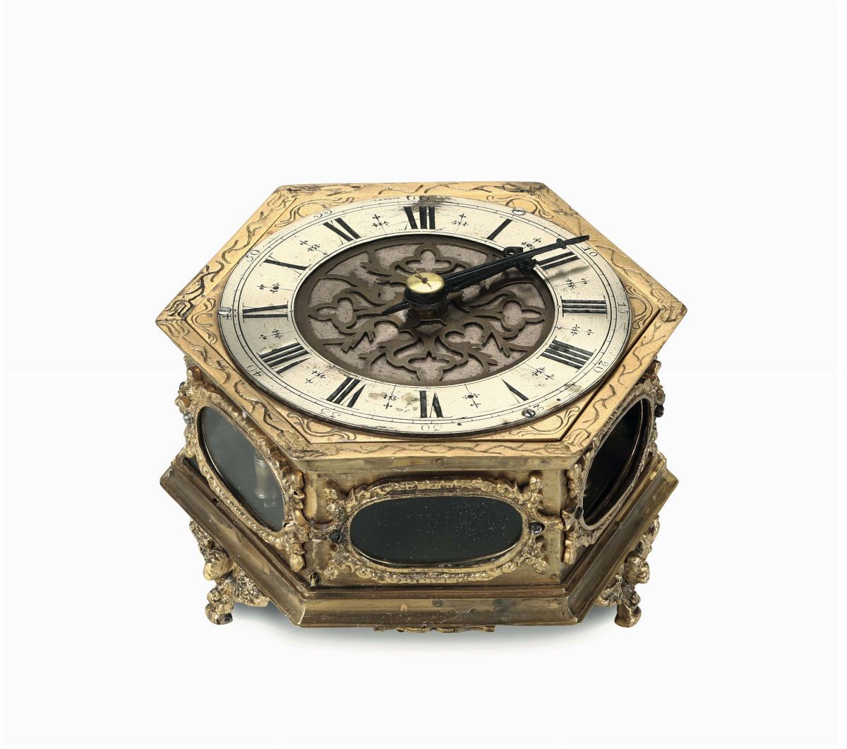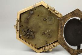 Cassa in bronzo dorato, scappamento a verga. Suoneria delle ore a passaggio e richiesta. Cm 14x8,5x14