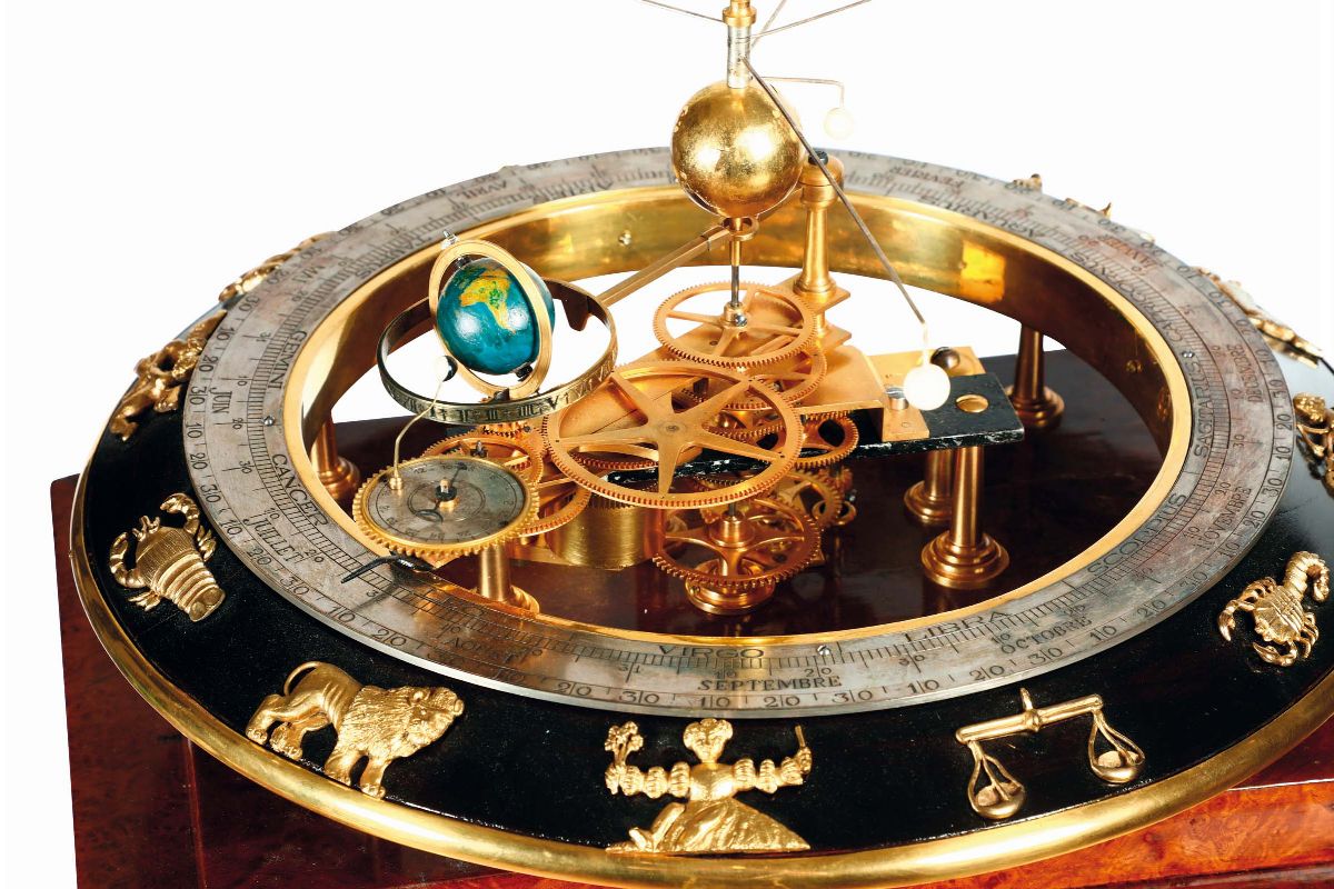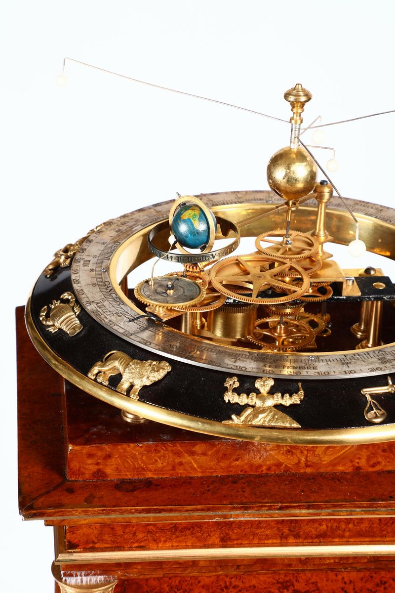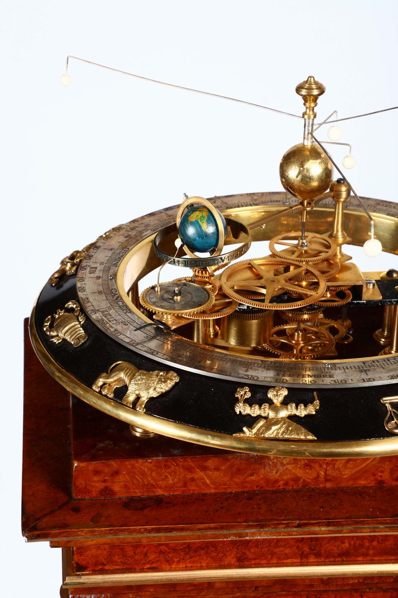 Planetario in legno ebanizzato con bronzi dorati ed argentati ed indica: Segni zodiacali, calendario annuale, mesi, giorni, periodi zodiacali, orario terrestre, giorno e notte, stagioni, fasi lunari, età della luna, sistema planetario, i pianeti (Venere, Marte, Giove e Saturno) sono digitali.