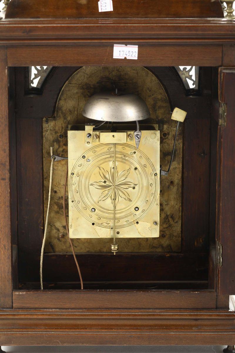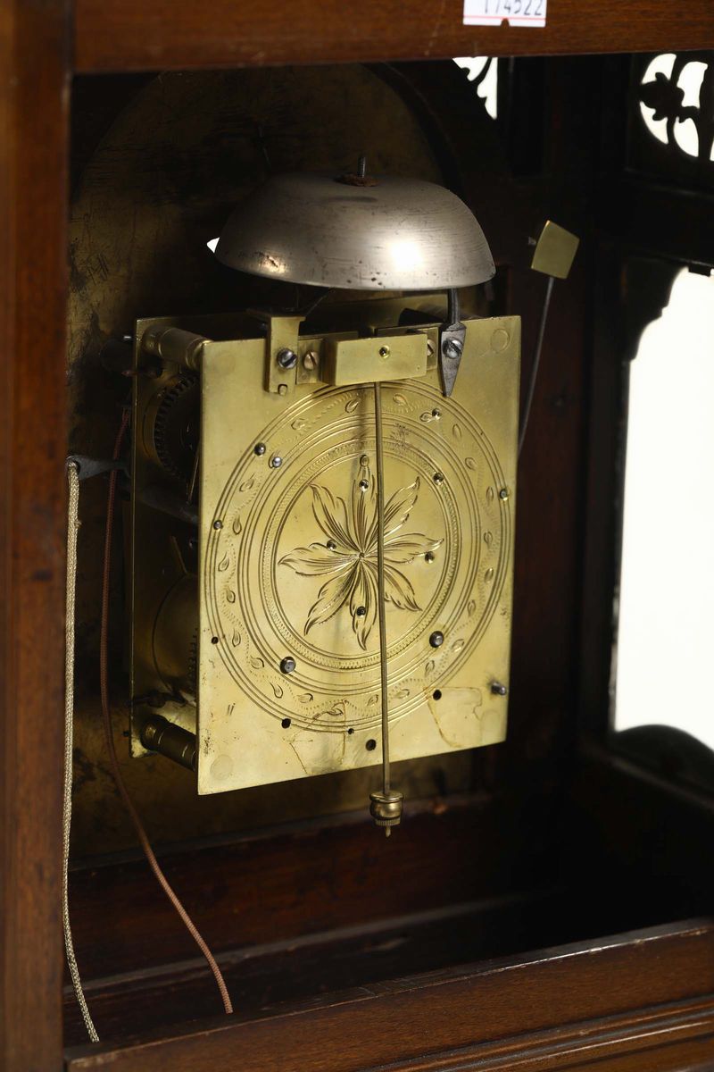 Cassa in legno color noce, quadrante in bronzo, scappamento a verga; suoneria delle ore a passaggio e richiesta. Cm 24x13,5x45 (pendolo non pertinente)