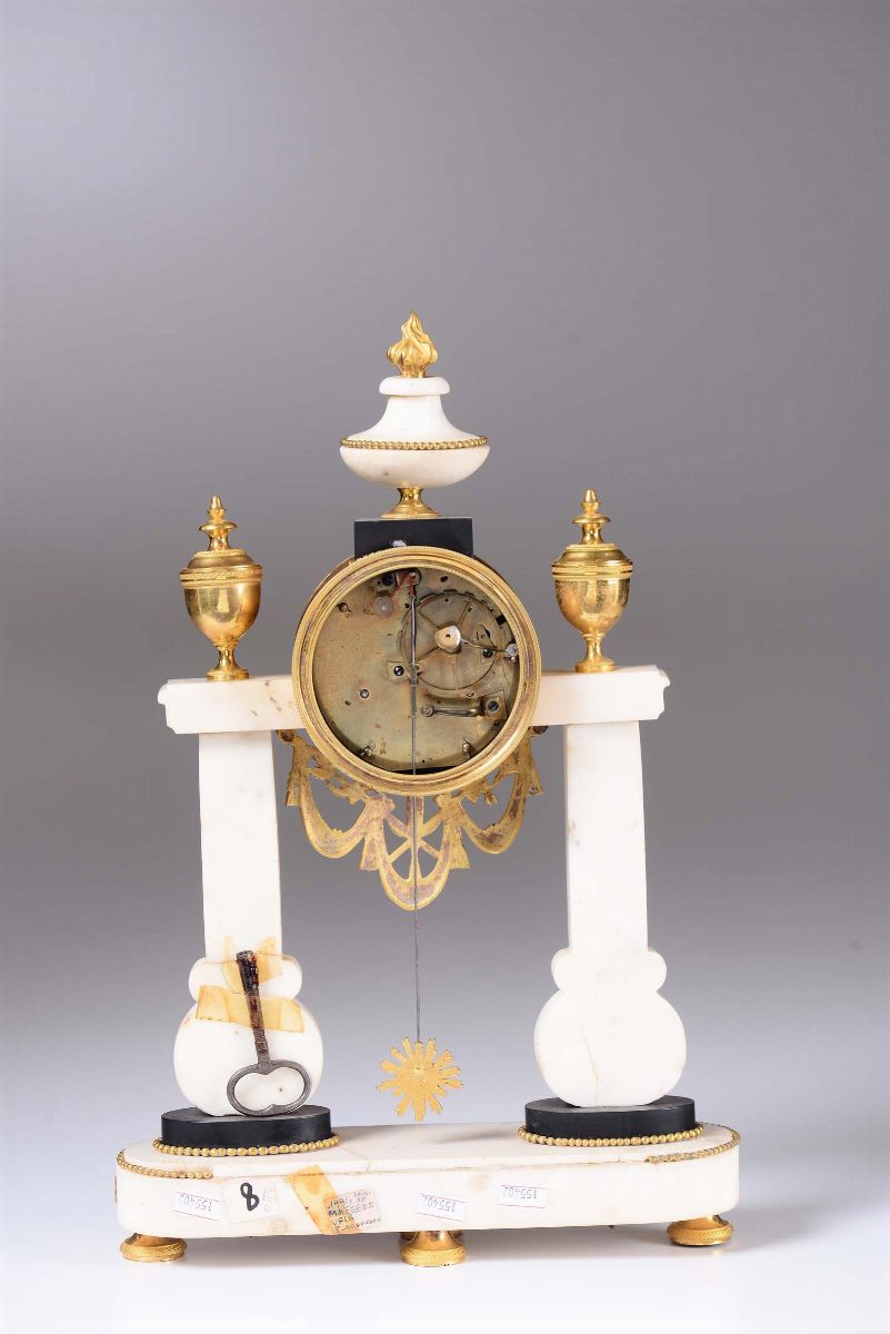 Struttura in marmo bianco con guarnizioni in bronzo dorato. Quadrante in smalto bianco con numerazione romana in nero per le ore e araba per i minuti, firmato Philibert a Paris.