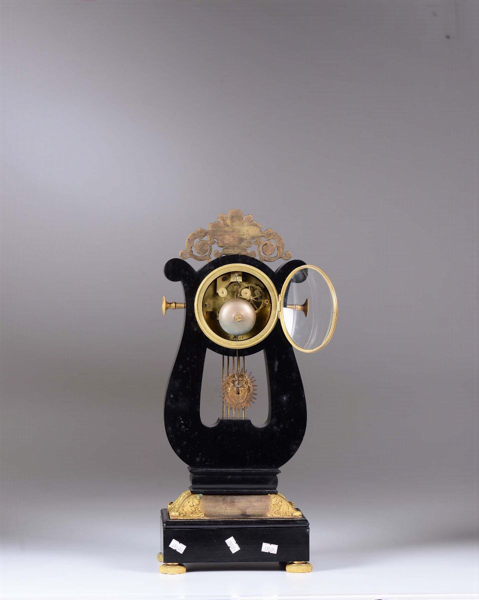 Struttura in legno ebanizzato con guarnizioni in bronzo dorato. Fascia oraria in smalto bianco con numerazione romana per le ore. Scappamento ad ancora con sospensione a filo, suoneria a ore e mezze al passaggio su campanello.
