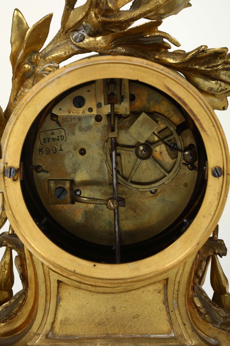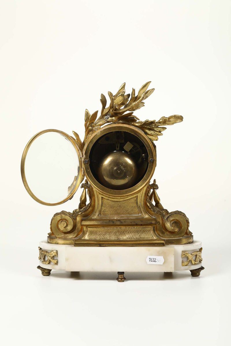 Cassa in bronzo dorato e marmo bianco con aplicazione di placca in porcellana policroma a motivo floreale, quadrante smaltato a numerazione romana per le ore e araba per la minuteria, cm 24x9,5x29