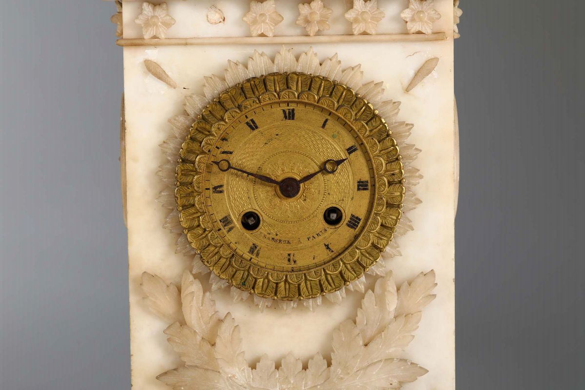 Pendola da tavolo in alabastro, Frasseur? a Paris, XIX secolo