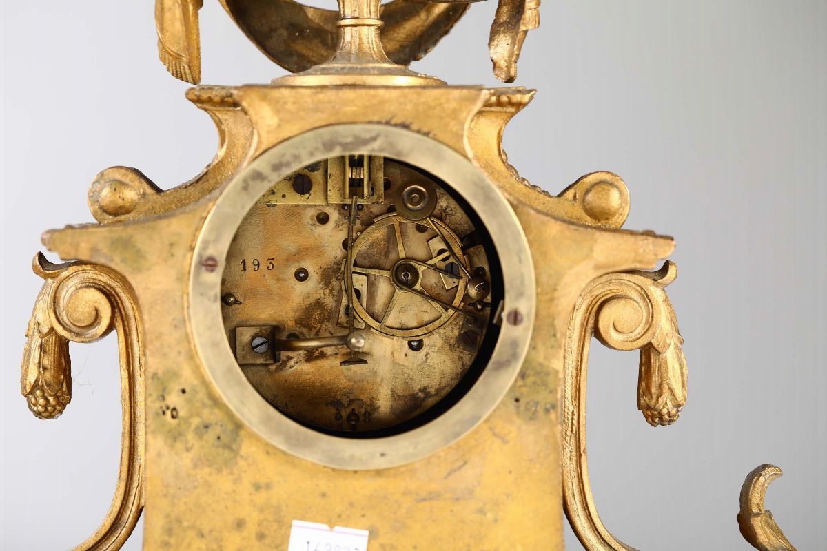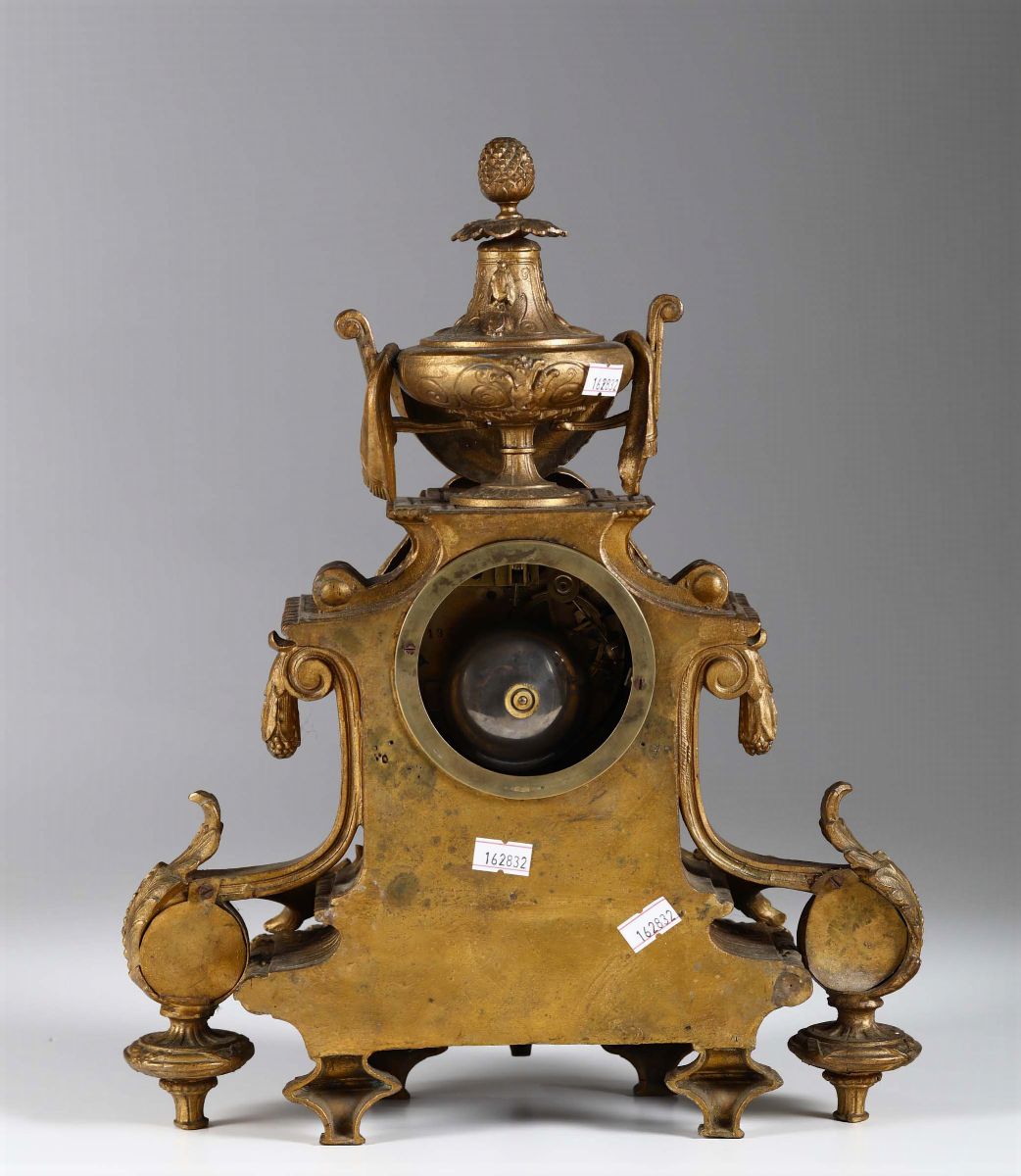 Pendola da tavolo in bronzo dorato con inserti in porcellana dipinta, fine XIX secolo