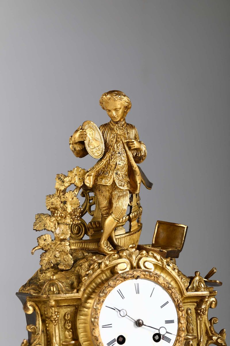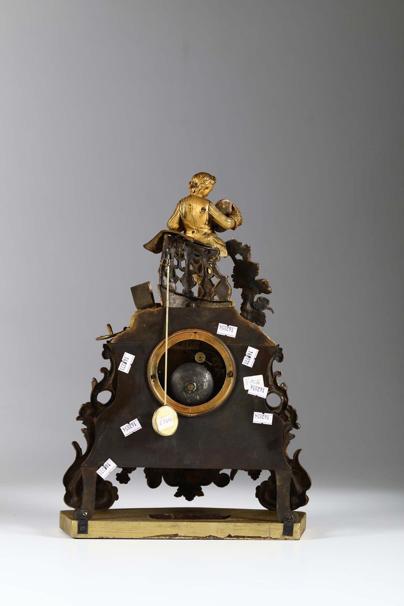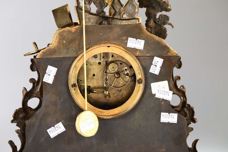 Cassa con figura maschile a tuttotondo sulla sommità; quadrante smaltato a numerazione romana per le ore.