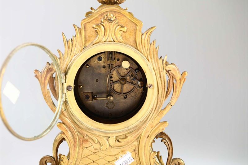 Cassa sagomata in bronzo dorato decorata a volute fogliacee e a ricciolo. Quadrante smaltato con numerazione romana per le ore e araba per i minuti firmato J.Mantel Ludere. Meccanica con sospensione a lamella e scappamento ad ancora, suoneria a ore e mezze al passaggio.