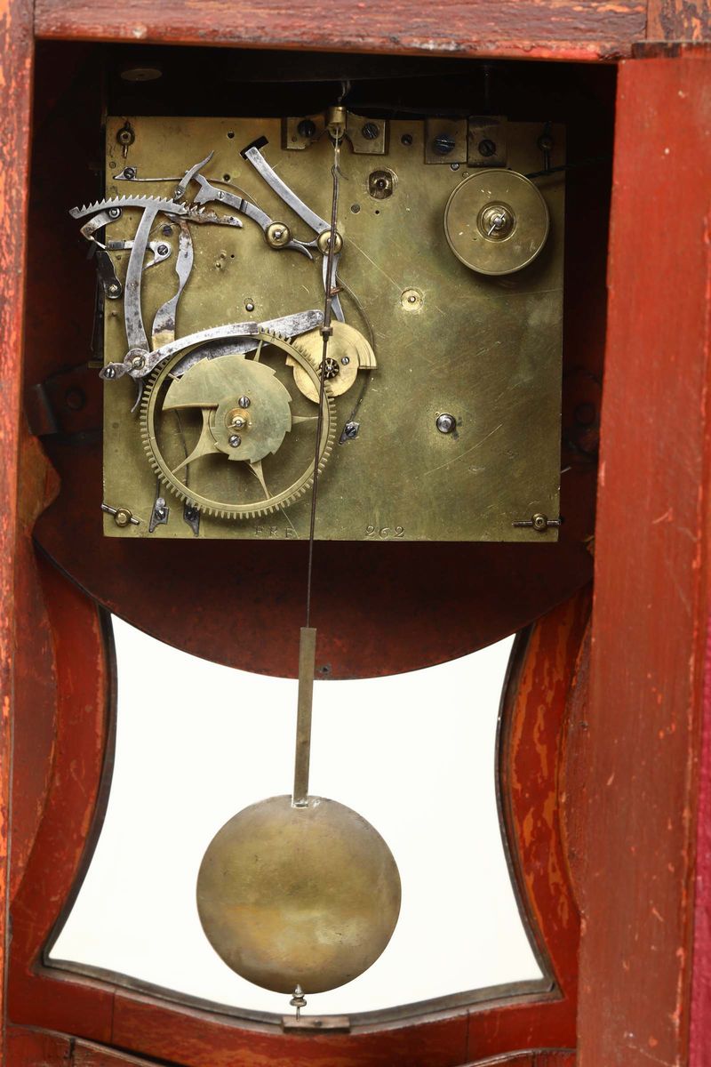 Cassa sagomata in legno lastronato e filettato, quadrante in metallo dorato a numerazione romana in nero perle ore, putto sulla sommità, altezza cm 80