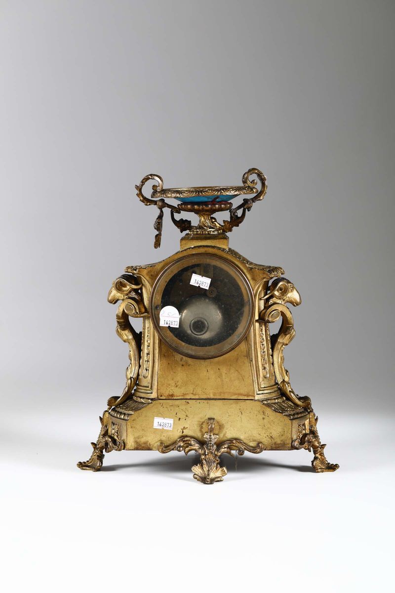 Pendola da tavolo in metallo dorato con inserti in porcellana, Francia Napoleone III