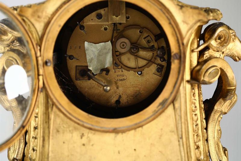 Quadrante dipinto con numerazione romana e araba sormontato da vaso biansato. Meccanica con sospensione a lamella e scappamento ad ancora, suoneria a ore e mezze al passaggio.