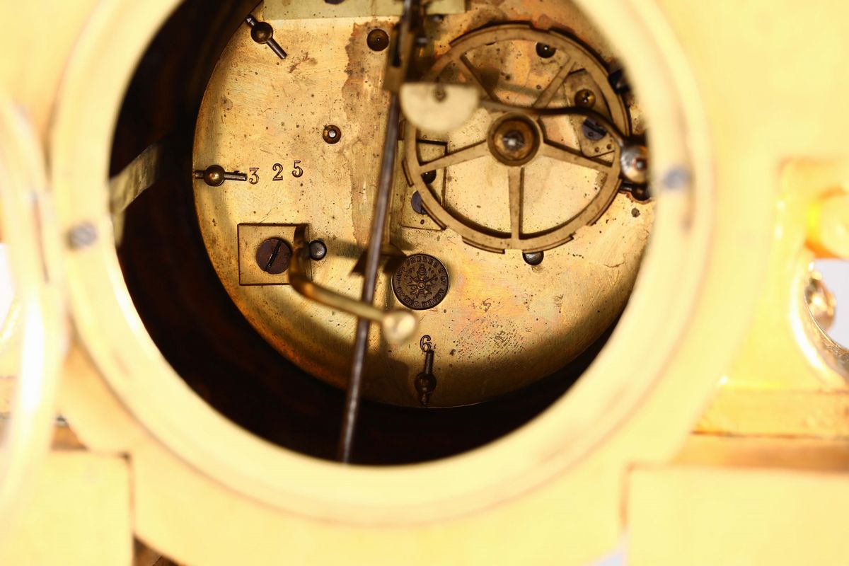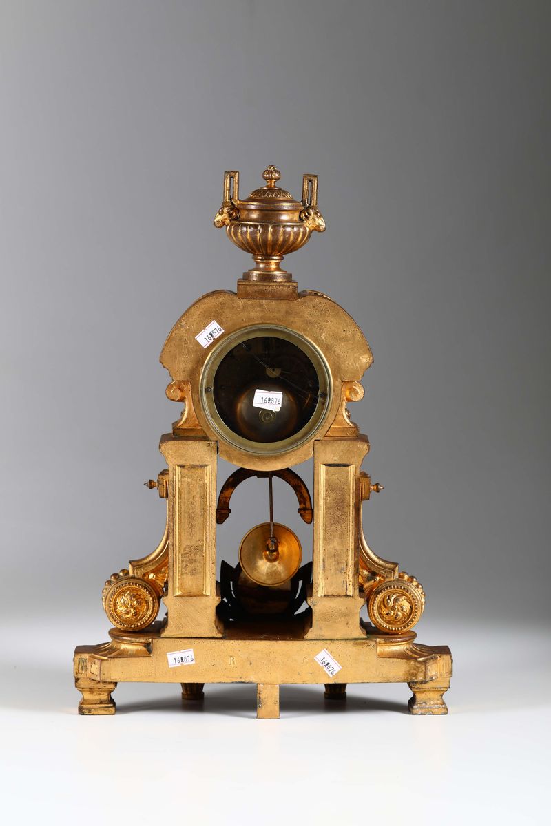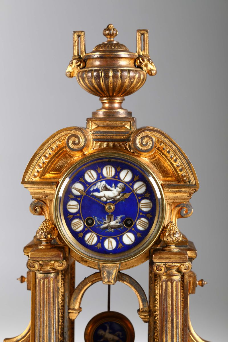 Pendola da tavolo in metallo dorato con inserti in porcellana dipinta, Francia fine XIX secolo