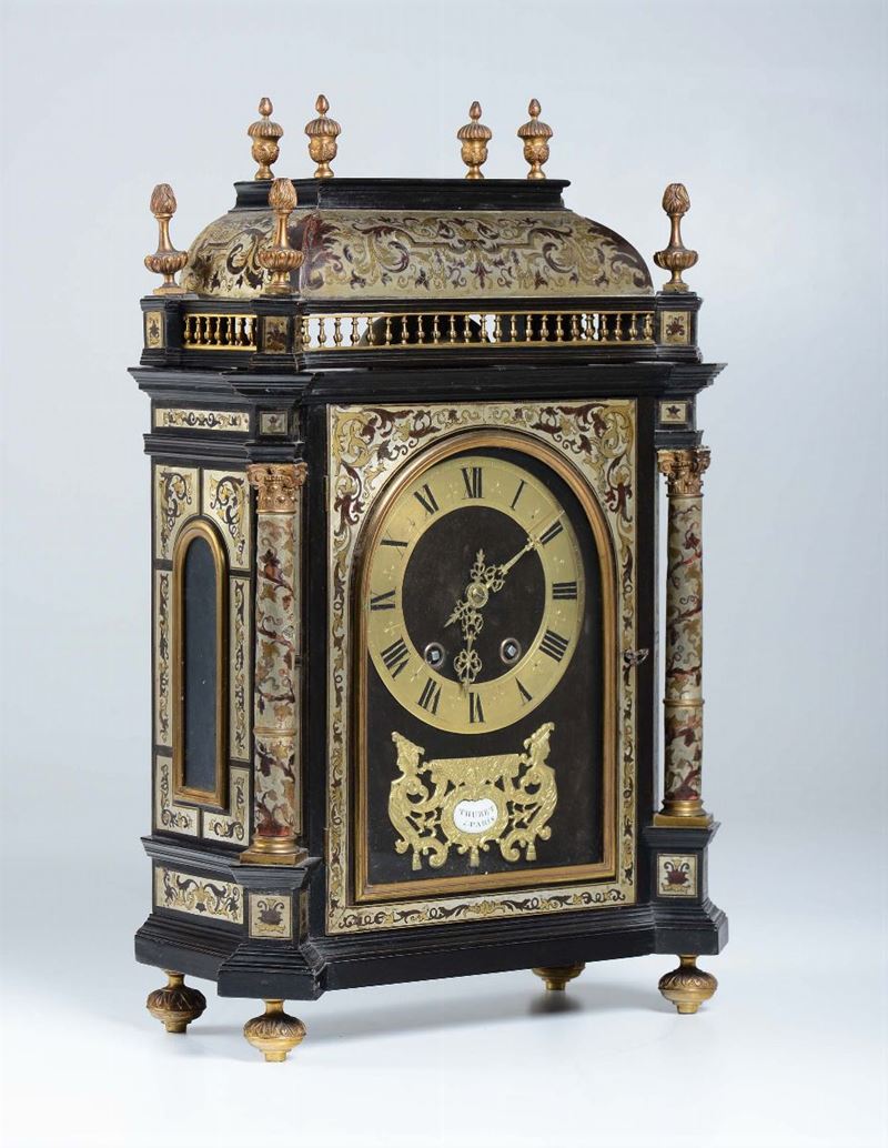 Cassa in legno e con decorazioni di tipo boulle, agli angoli quattro colonne con capitelli corinzi in bronzo dorato, quadrante con fascia oraria in metallo con numeri romani incisi e applicata su uno sfondo di velluto nero. Firmato su una placchetta in smalto bianco Thuret a Paris. Meccanica quadrata con scappamento ad ancora, suoneria a ore e mezze su campana.