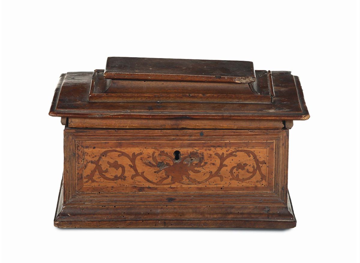 Forma rettangolare con cornici modanate e fascia con intarsi a girali. Coperchio a sarcofago con sportello scorrevole sulla sommità.