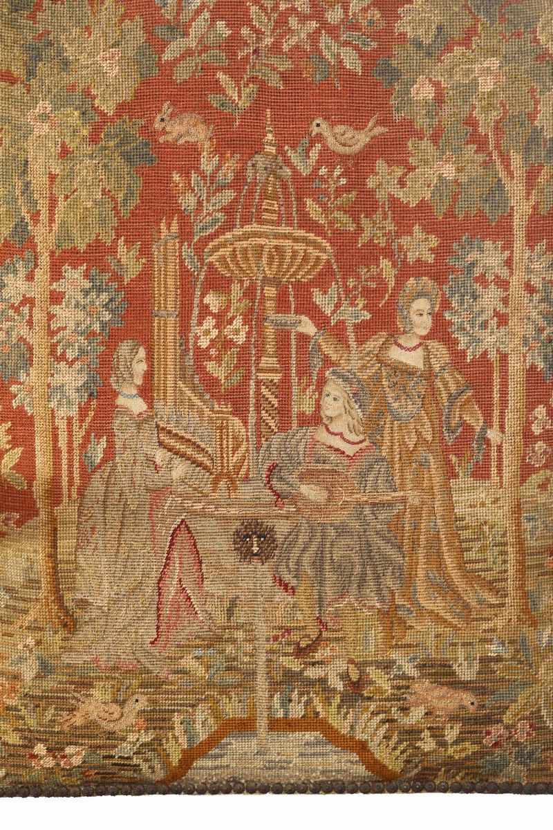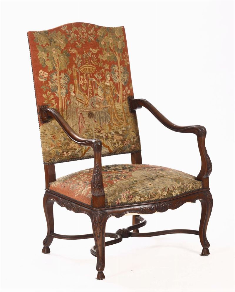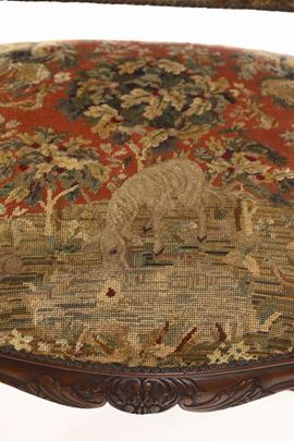 gambe arcuate riunite da crociera, seduta e schienale imbottiti e rivestiti da tessuto a piccolo punto