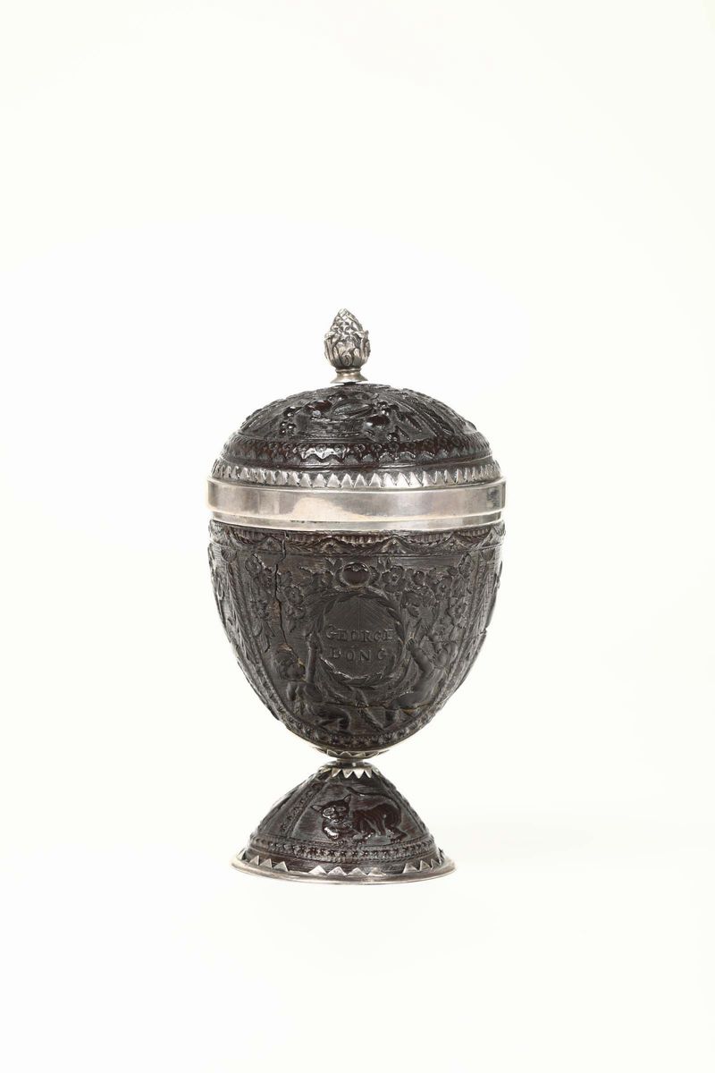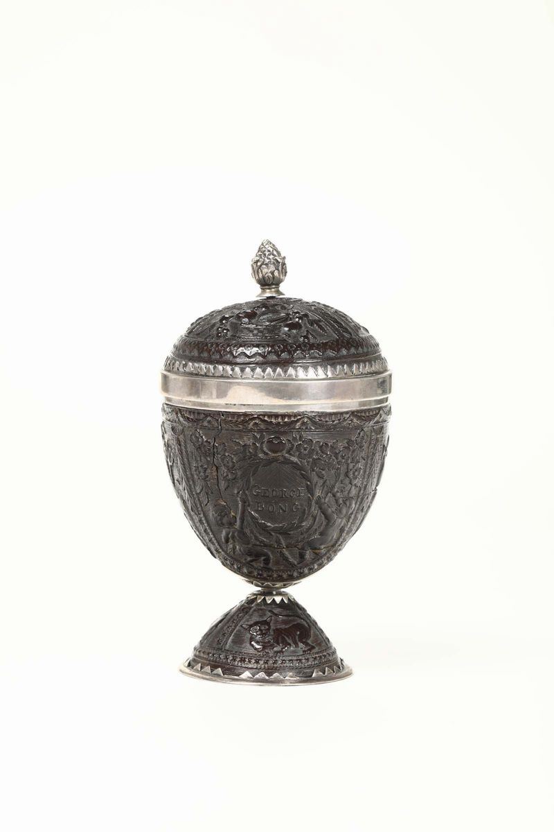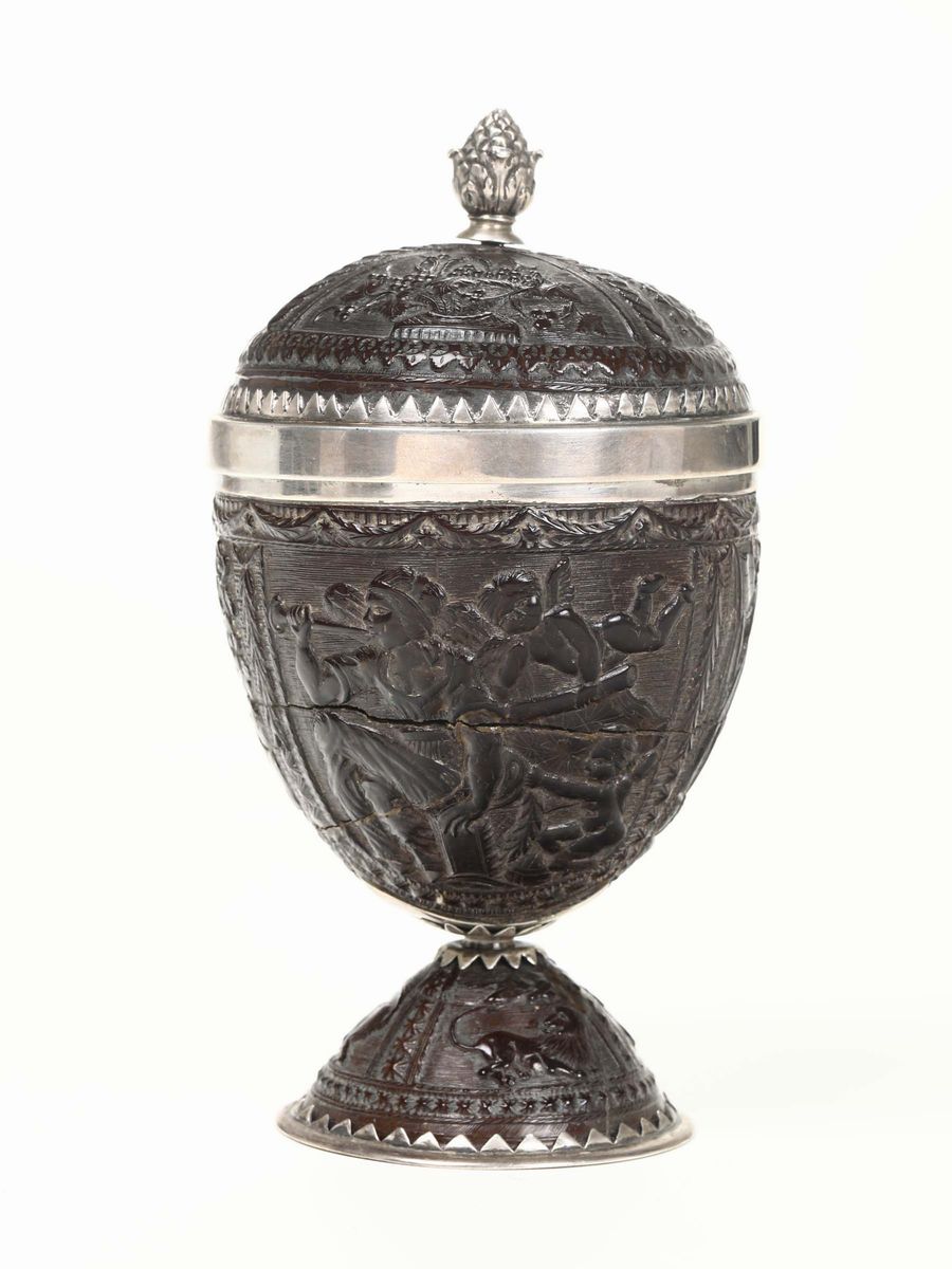 Porta bon-bon in noce di cocco intagliata, XIX secolo