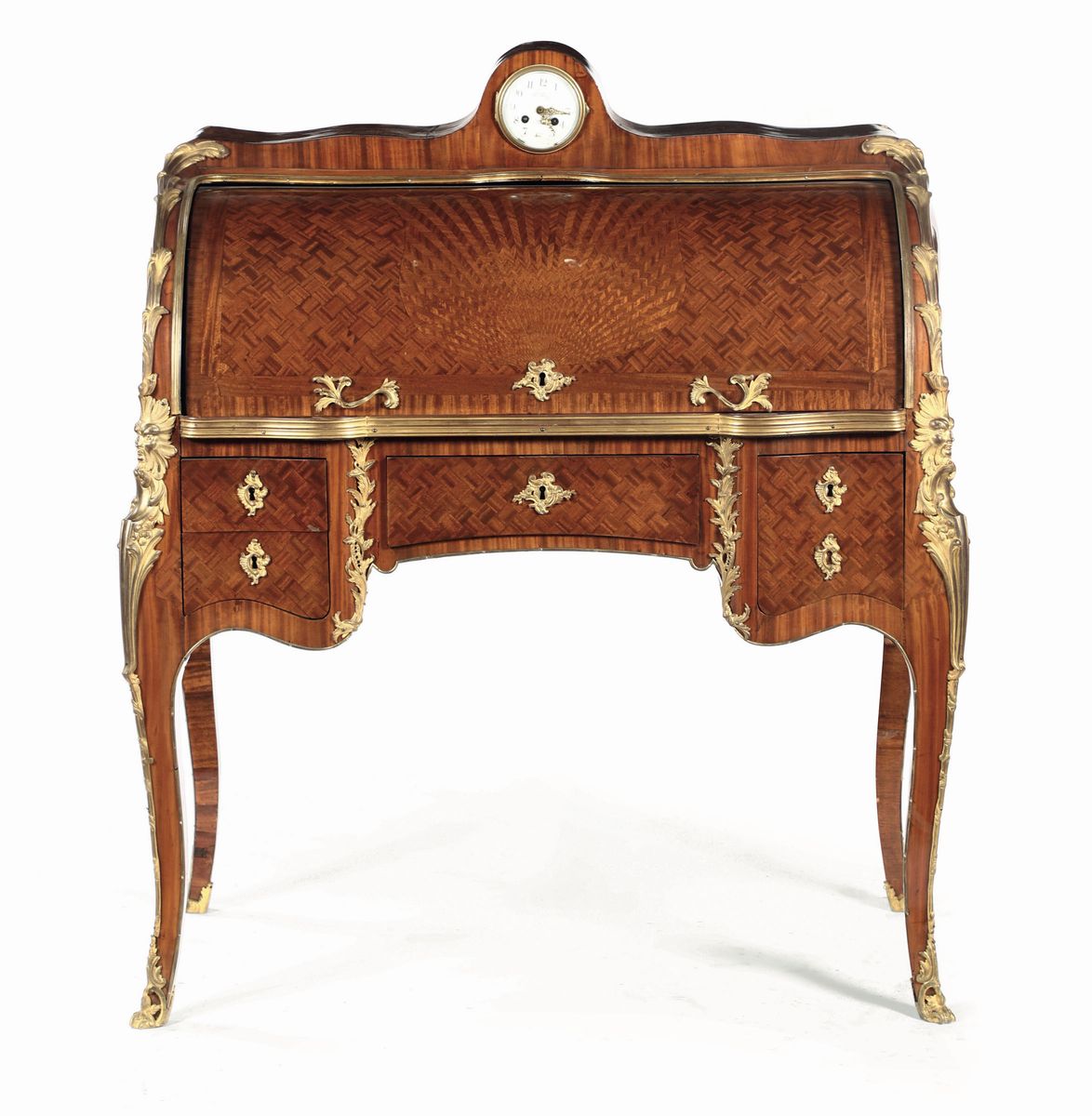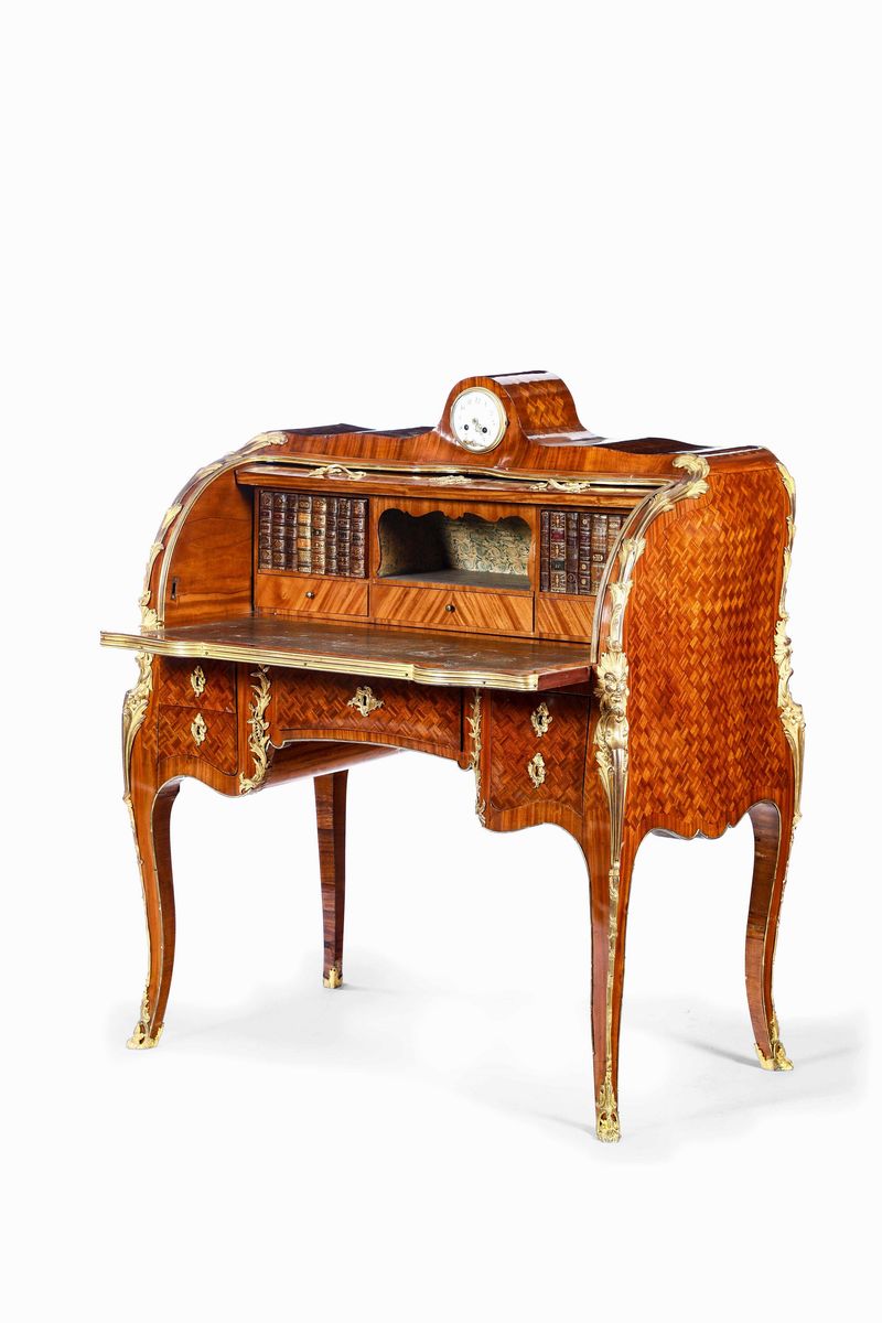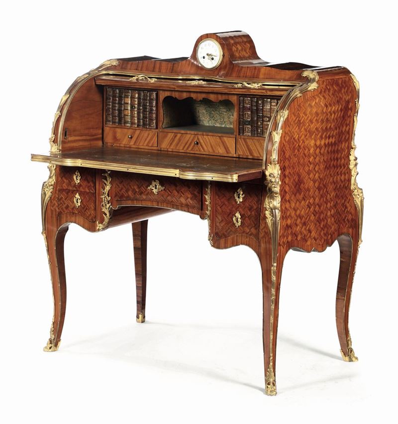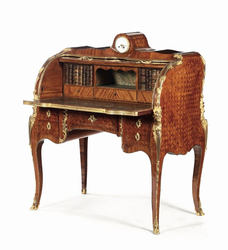 Rara coppia di bureau a cilindro a rullo lastronate a marqueterie, Francia, epoca Napoleone III, XIX secolo