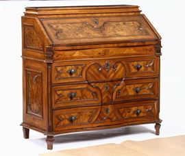 fronte mosso a tre cassetti, calatoia celante sei cassettini e vano segreto, fianchi dritti pannellati, cm 128x56x113