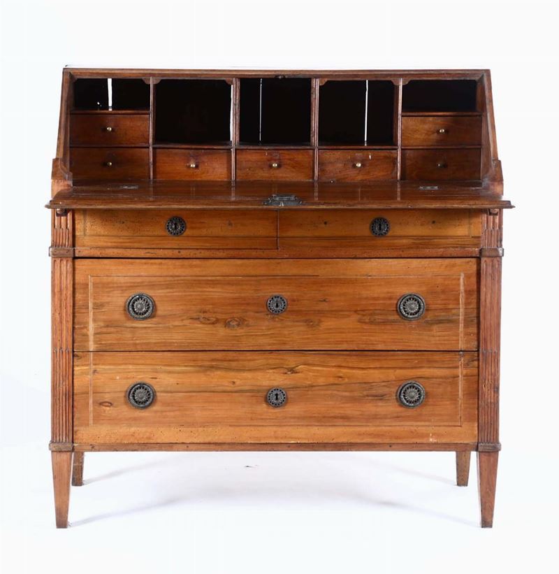 fronte a due cassetti più due affiancati sotto la calatoia; all’interno sette cassettini e vani portadocumenti, scanalature sui montanti, piede troncopiramidale, cm 115x56x120