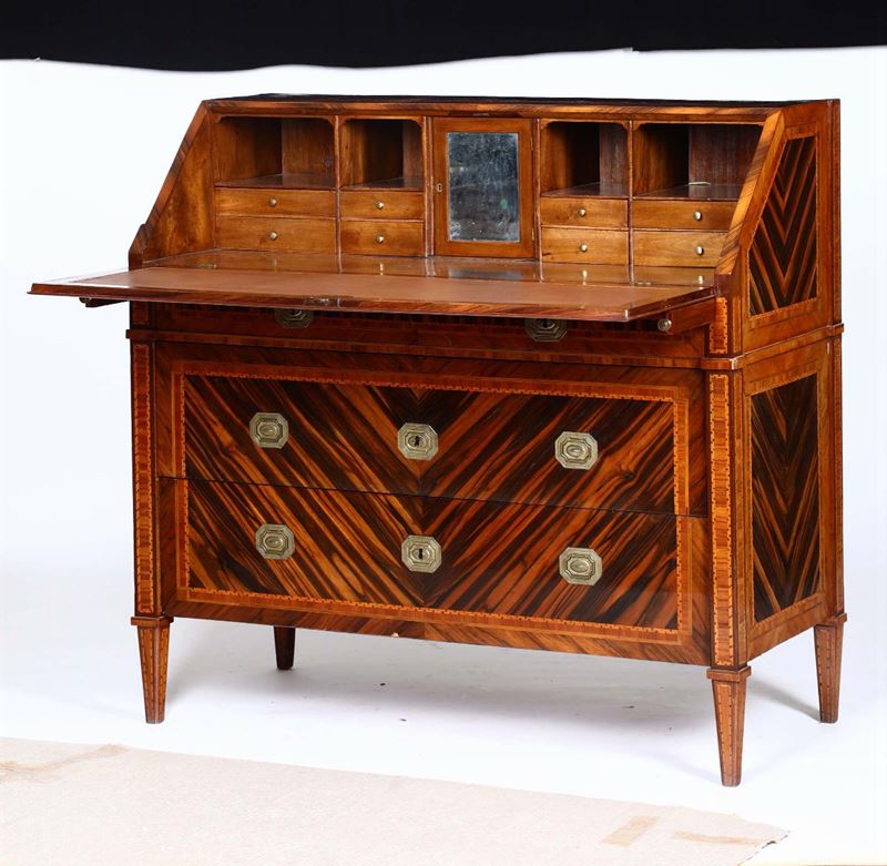 fronte e fianchi dritti, tre cassetti, calatoia celante otto cassettini con vani a giorno sovrastanti ed antina a specchio centrale, cm 120x57x118
