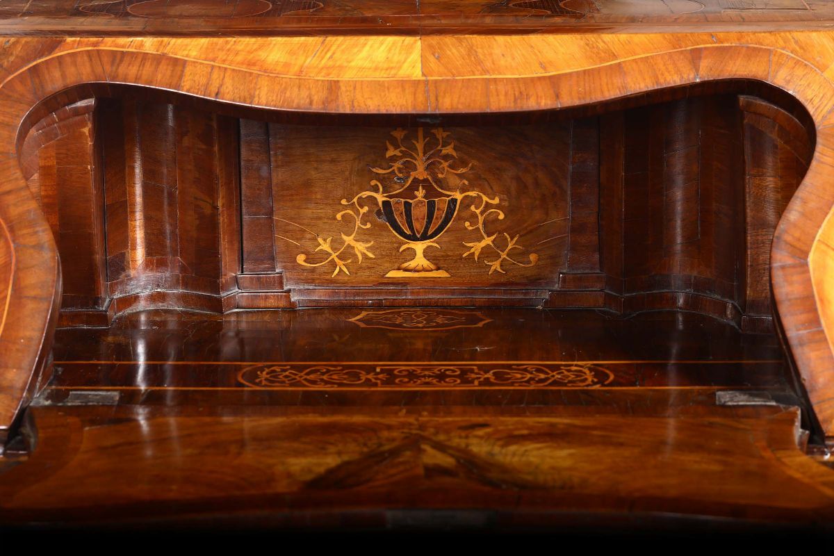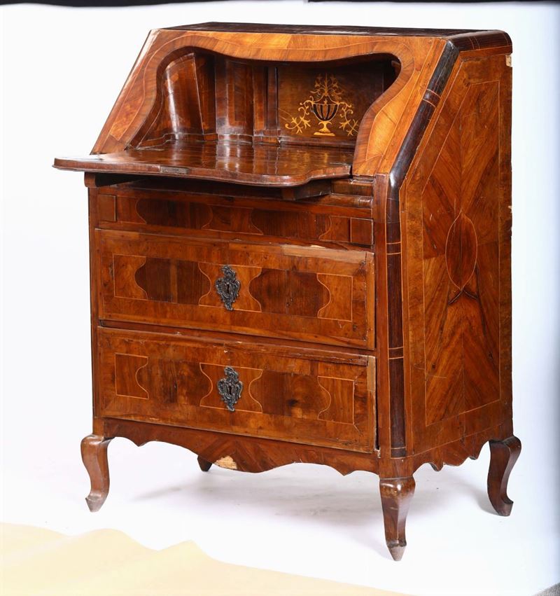 fronte a due cassetti, calatoia con vano a giorno centrato da decoro intarsiato di vaso bacellato, cm 85x48x107