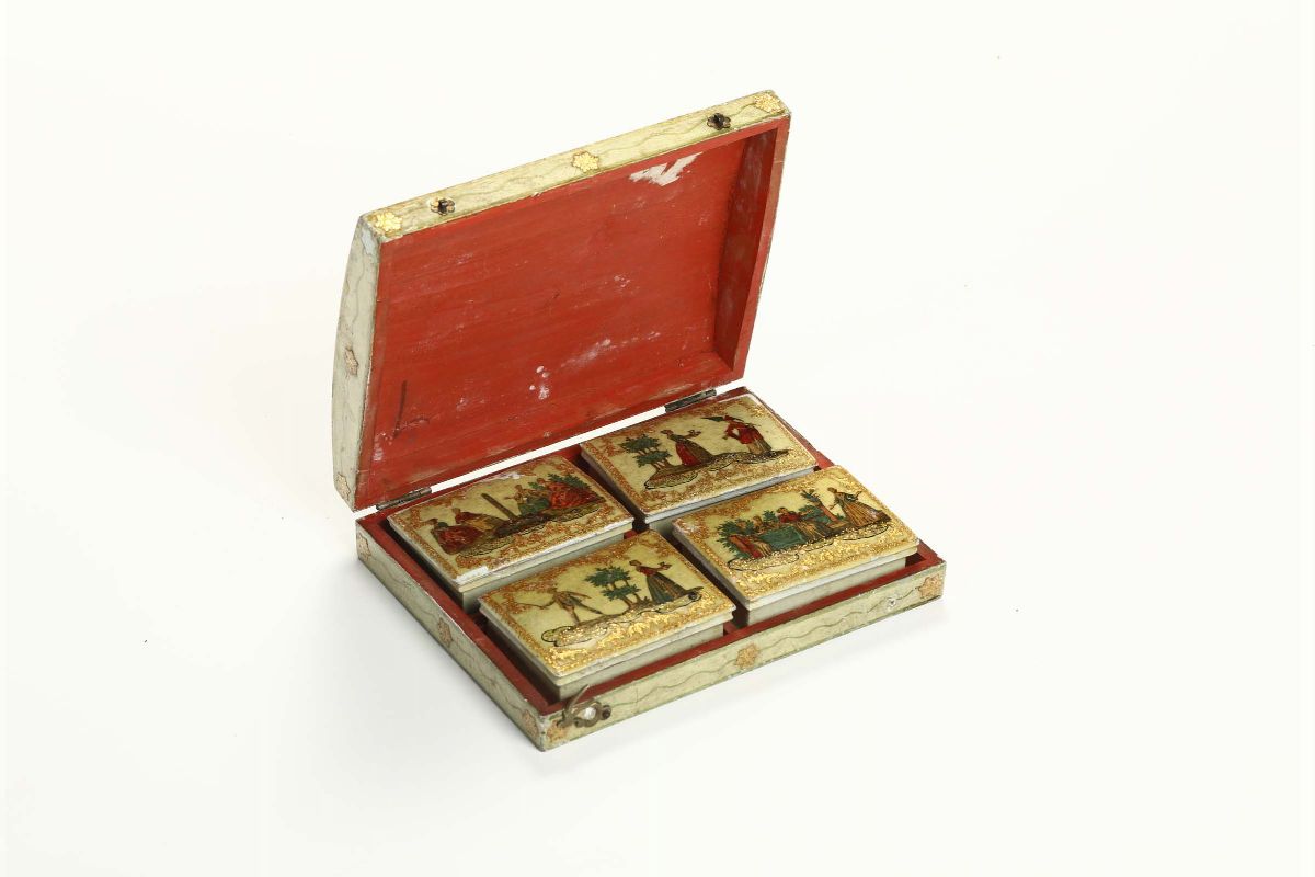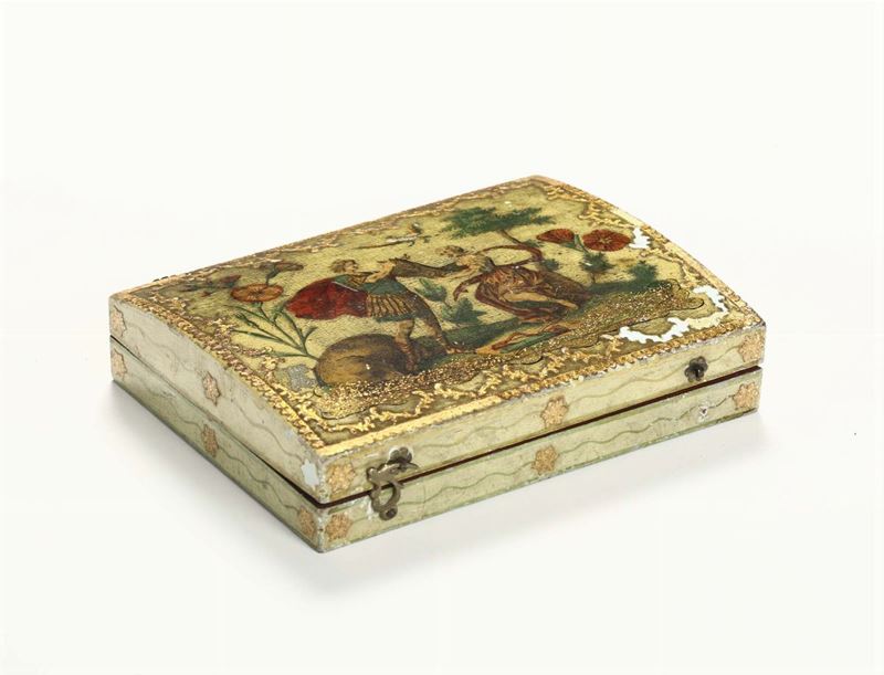 Scatola in legno dipinto ad arte povera con figure e paesaggio, XIX secolo