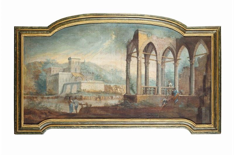 Scuola bolognese dell’inizio del XVIII secolo Veduta con castello sullo sfondo Prospettiva con rovine e pescatori