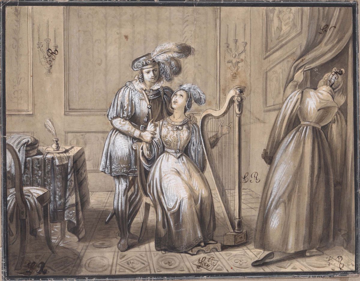Scena di interni con figura femminile che suona l’arpa