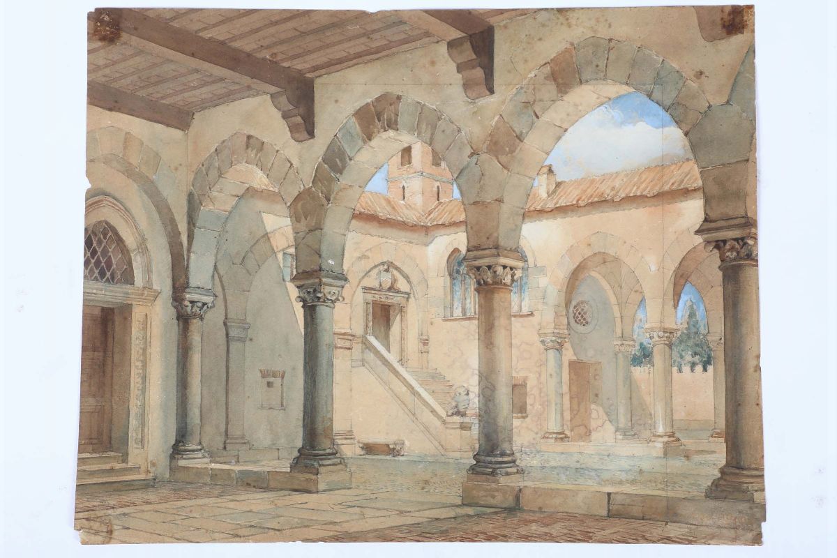 Scuola dell’Italia centrale, XIX secolo Veduta di corte interna di palazzo Vescovile