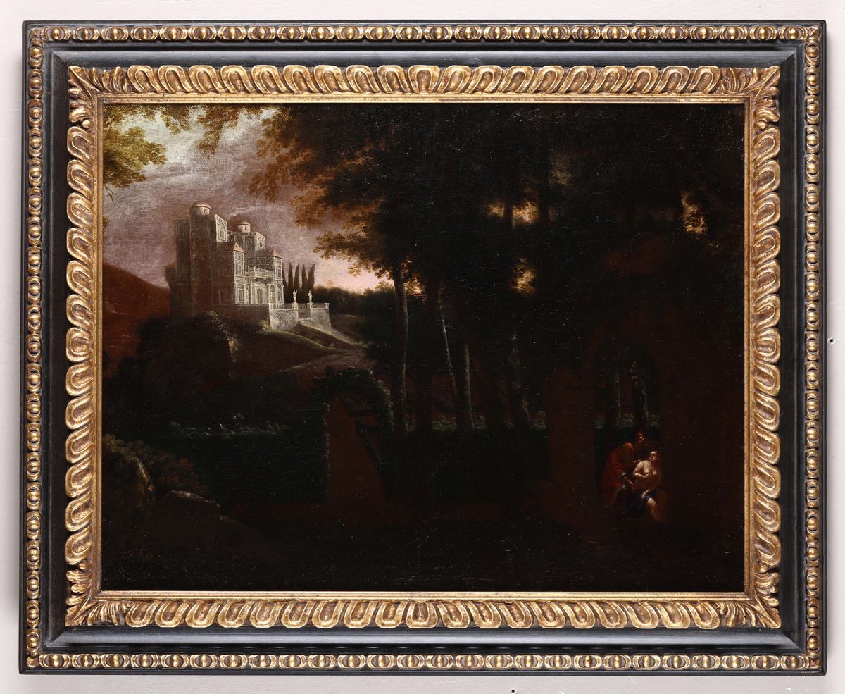 Scuola romana del XVII secolo Veduta con villa, giardino e figure
