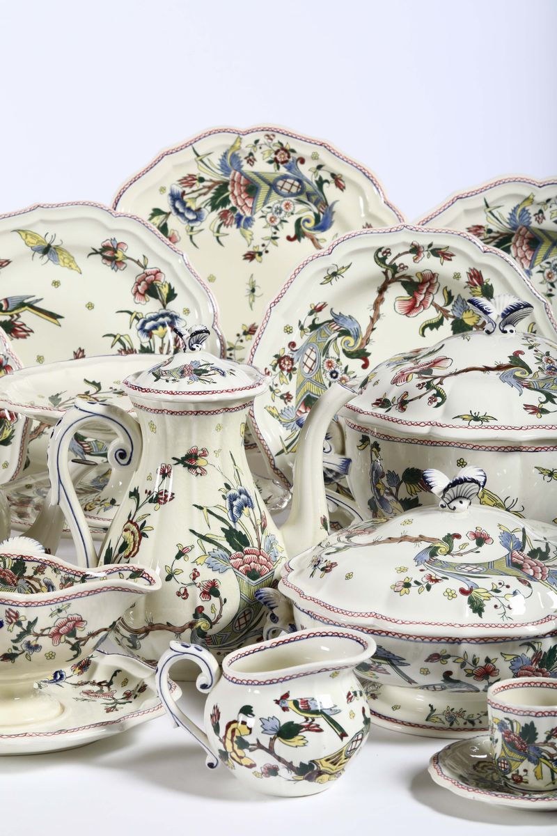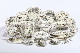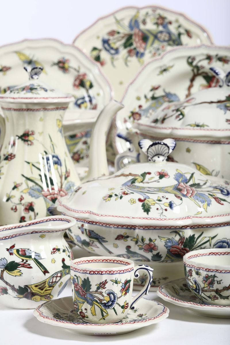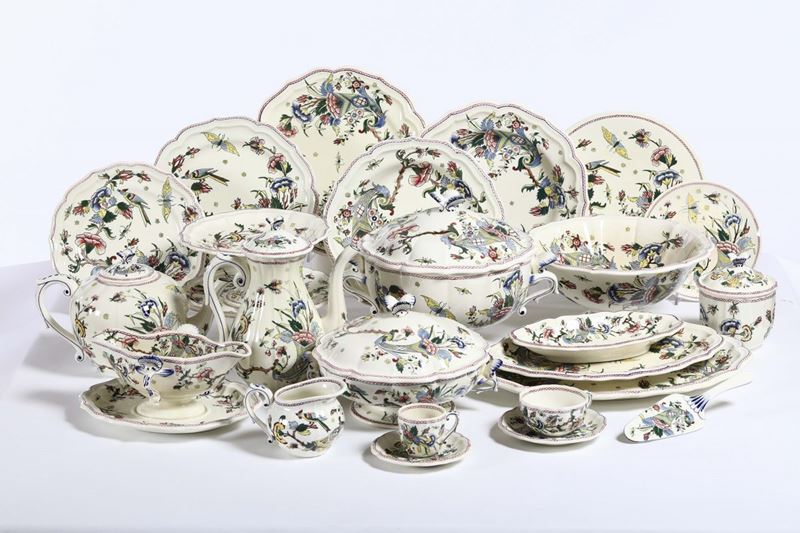 Costituito da 277 pezzi é così composto: 36 piatti fondi diam. cm 25,5 (uno con sbeccatura); 83 piatti piani diam. cm 25,5 (sei con sbeccature); 24 piatti da frutta diam. cm 20; 35 piatti piani diam. cm 23; 3 zuppiere con coperchio; 3 legumiere con coperchio (una con i manici rotti); 2 insalatiere; 3 piatti ovali cm 41x26,5; 3 piatti ovali cm 35x21; 8 piatti ovali cm 27x13,5 (2 pezzi con sbeccatura al bordo); 3 piatti piani diam. cm 31; 1 piatto fondo diam. cm 31; 2 piatti piani diam. 28; 2 piatti fondi diam. cm 28; 2 piatti piani per formaggi diam. cm 28,5; 3 alzatine fonde diam. cm 23,5; 3 alzatine piane diam. cm 25,5; 3 salsiere; 2 insalatiere diam. cm 31;