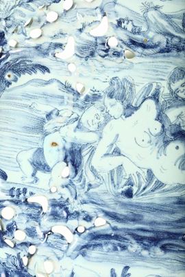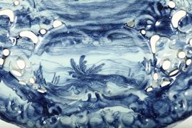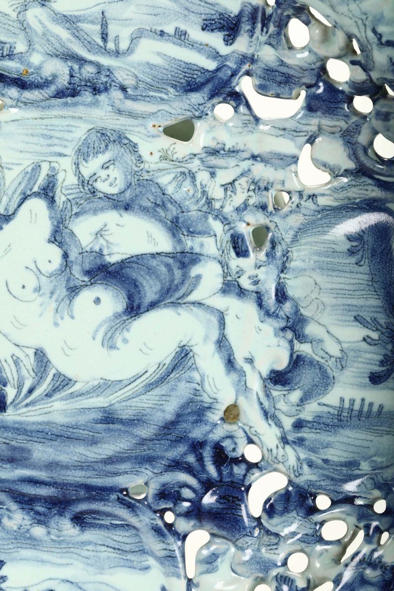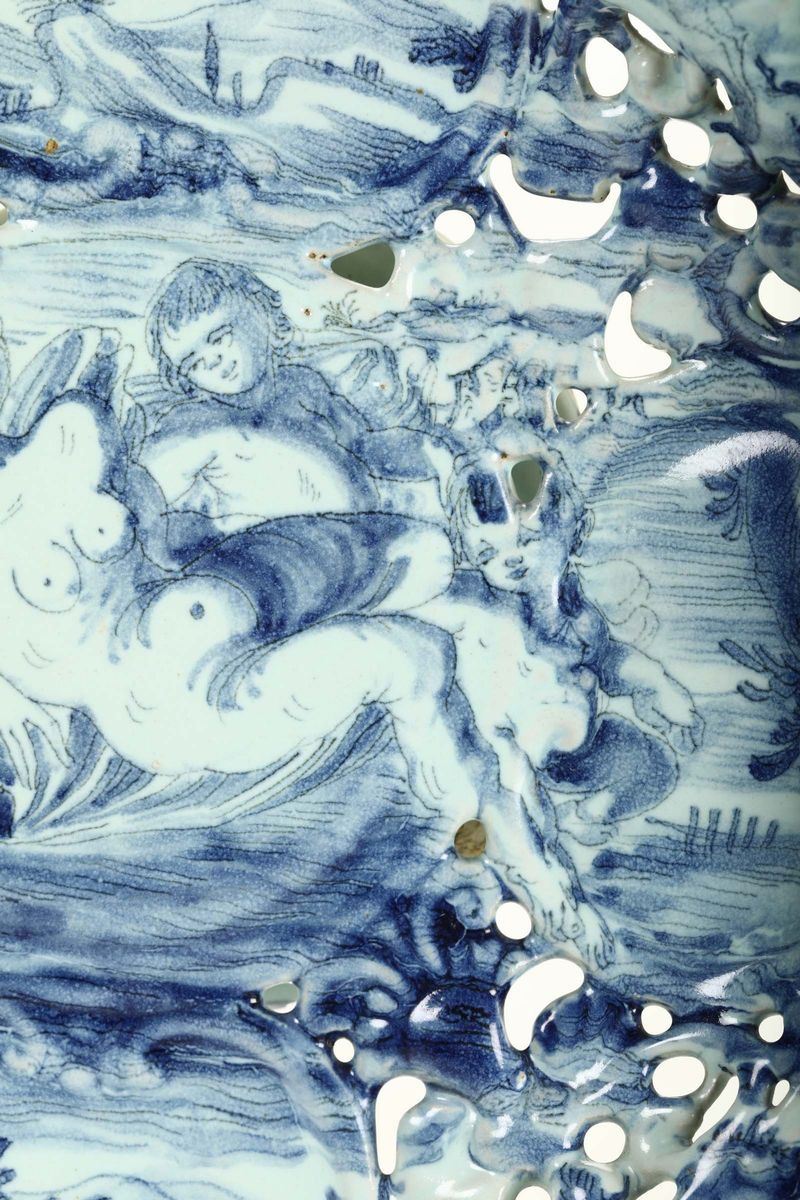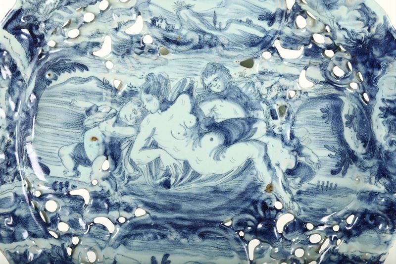 Dal profilo mistilineo ospita una decorazione in monocromia blu di cobalto con una scena ispirata alla mitologia in ampio paesaggio che si estende, senza distinzione, su tutta la superficie comprese le riserve