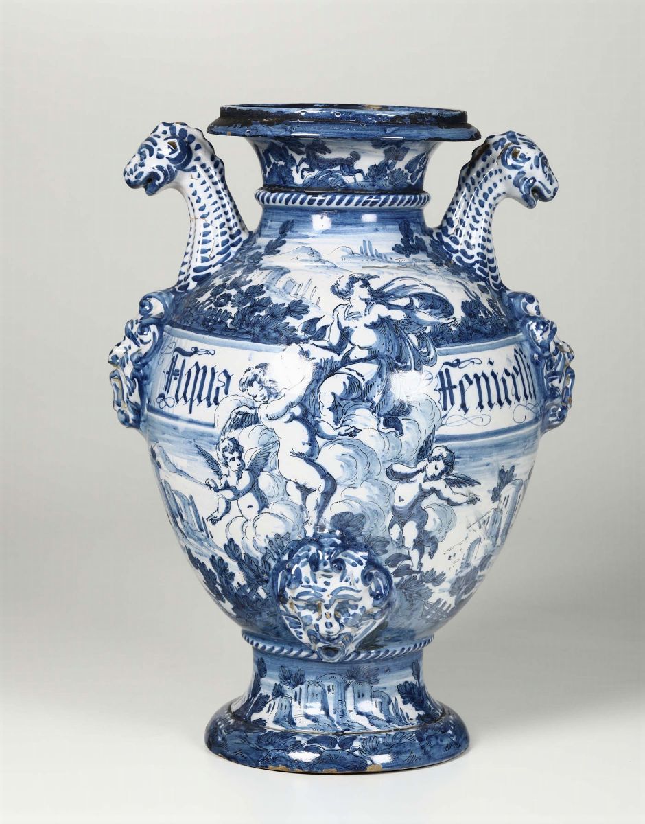 Dalla forma ovoidale ha le anse a protomi leonini su mascheroni, un terzo mascherone dalla bocca forata é destinato ad ospitare la spina. Decorazione con putti alati, personaggio mitologico e guerriero in ampio paesaggio. Inoltre cartiglio con iscrizione apotecaria