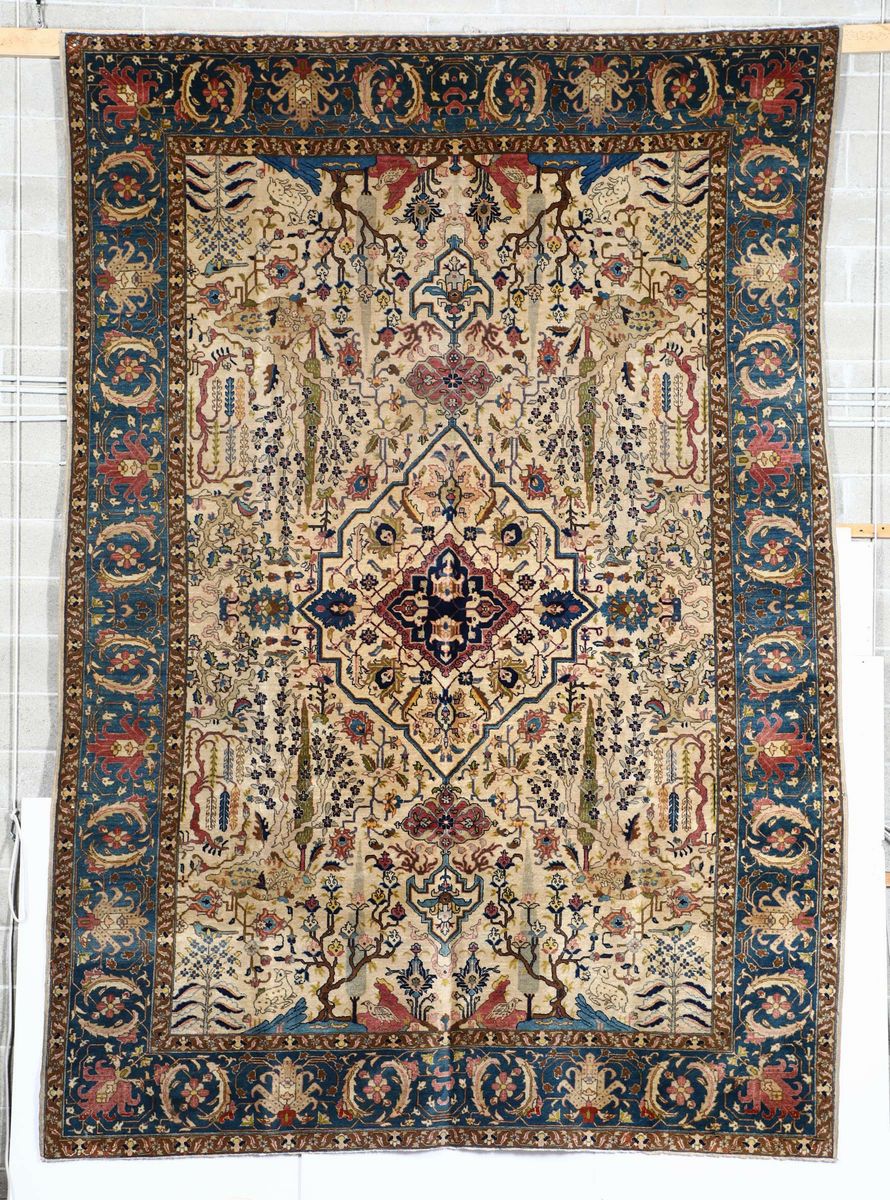 campo chiaro con piccolo medaglione centrale, alberi ed animali, bordura blu/azzurra con foglie e fiori cm 273x386