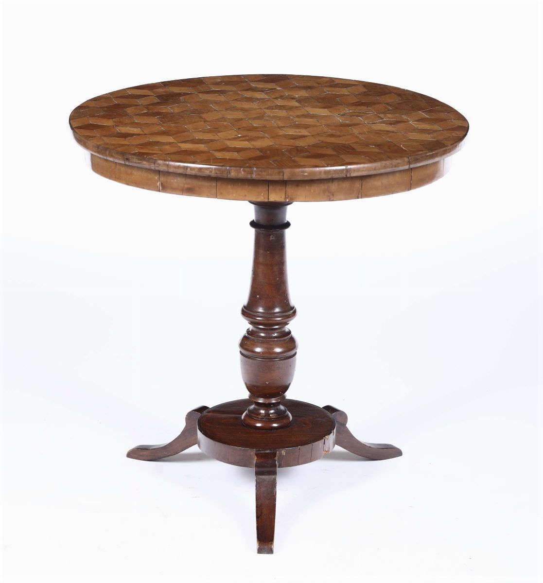 Tavolo con piano circolare lastronato ed intarsiato a motivi geometrici, XIX secolo