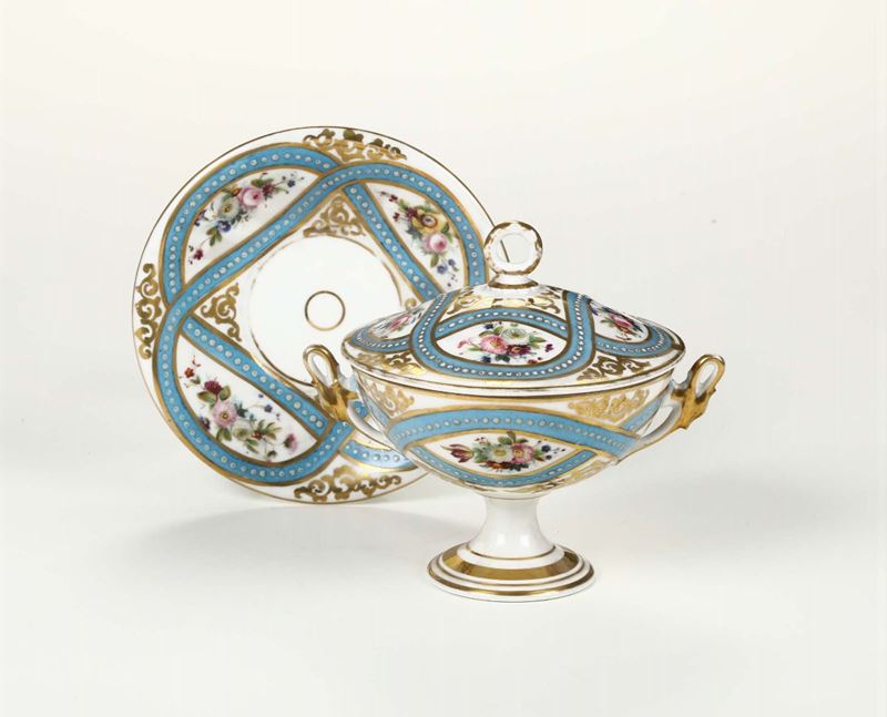 Tazza da brodo con coperchio e sottopiatto decorati a mazzetti di flori in riserve formate da nastri azzurri perlinati; anse a forma di testa di cigno