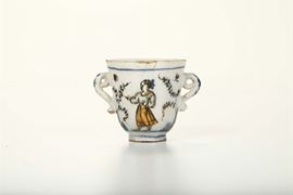 Tazza con due manici decorata con una figuretta femminile tra tronchi d'albero e ruderi d'archi spezzati