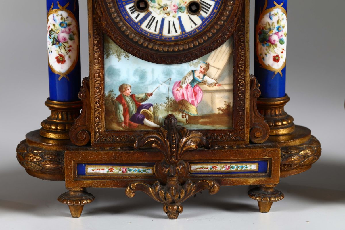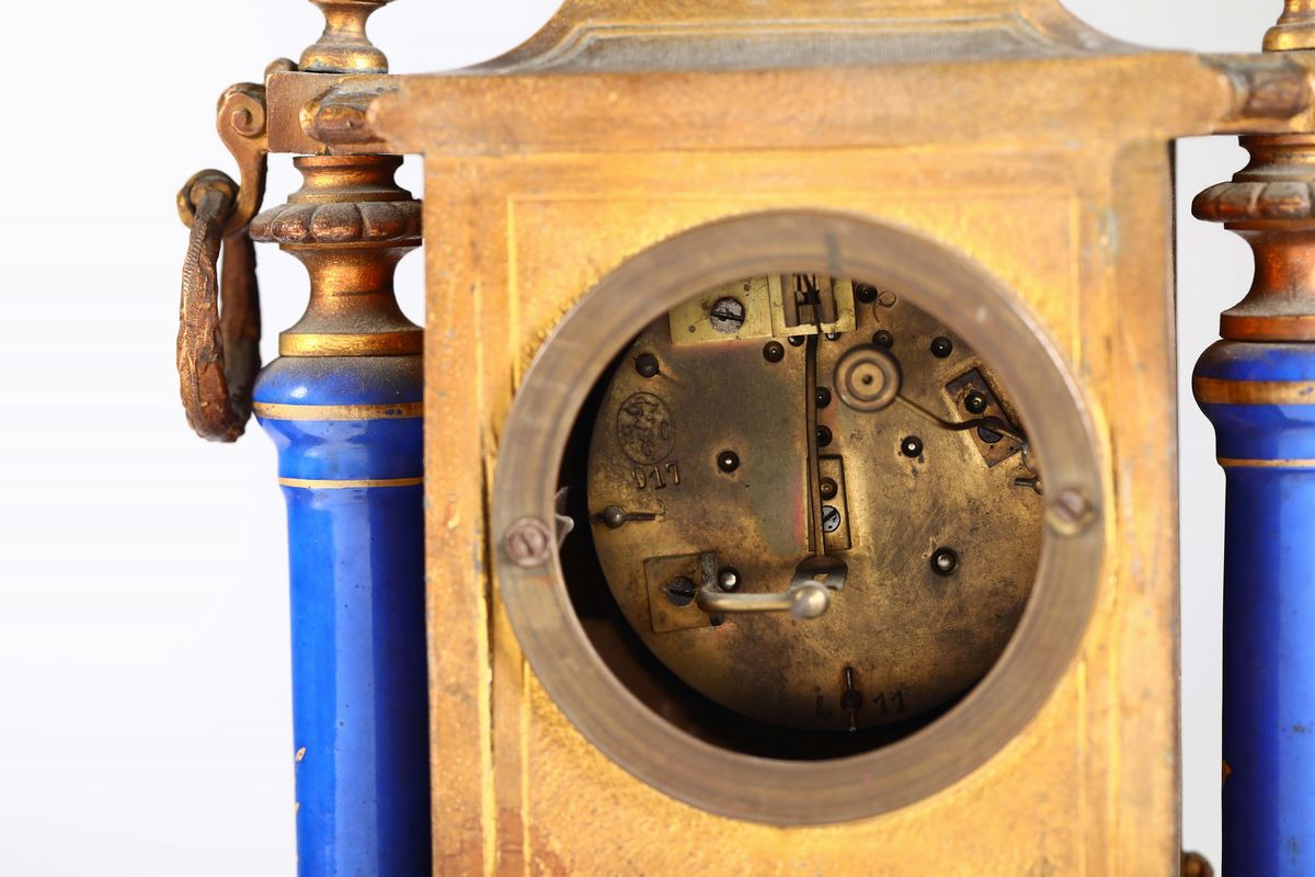Orologio con colonne in porcellana dipinte su fondo blu in policromia a motivo floreale. Quadrante con numerazione romana sormontato da vaso biansato e con scena galante alla base. Meccanica con sospensione a lamella e scappamento ad ancora, suoneria a ore e mezze su rastrello al passaggio.